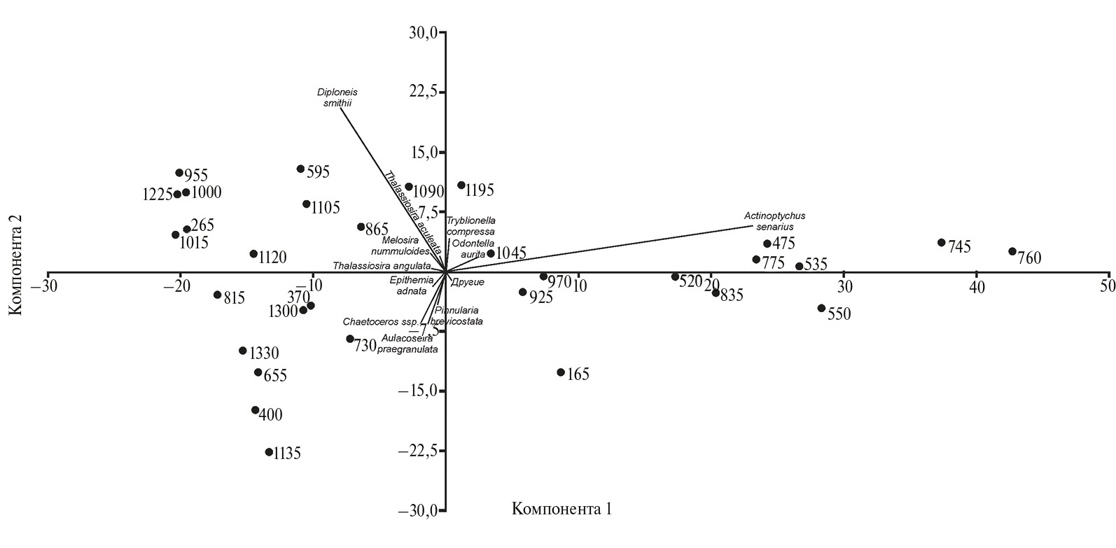 Необходимо отметить, что в интервалах (1030–1055; 715–720; 625–630; 505–510; 445–450; 310–115; 250–255; 235–240) обнаружены единичные створки диатомей. Бедность осадков диатомеями в данных интервалах может свидетельствовать об активной гидродинамике, а также о высоких скоростях осадконакопления, во время которого происходило образование изученной толщи отложений, о чем говорят и незначительные изменения в видовом составе диатомей. К сожалению, низкая концентрация створок в препаратах данных интервалов является ограничением использования статистических методов, в том числе РСА.