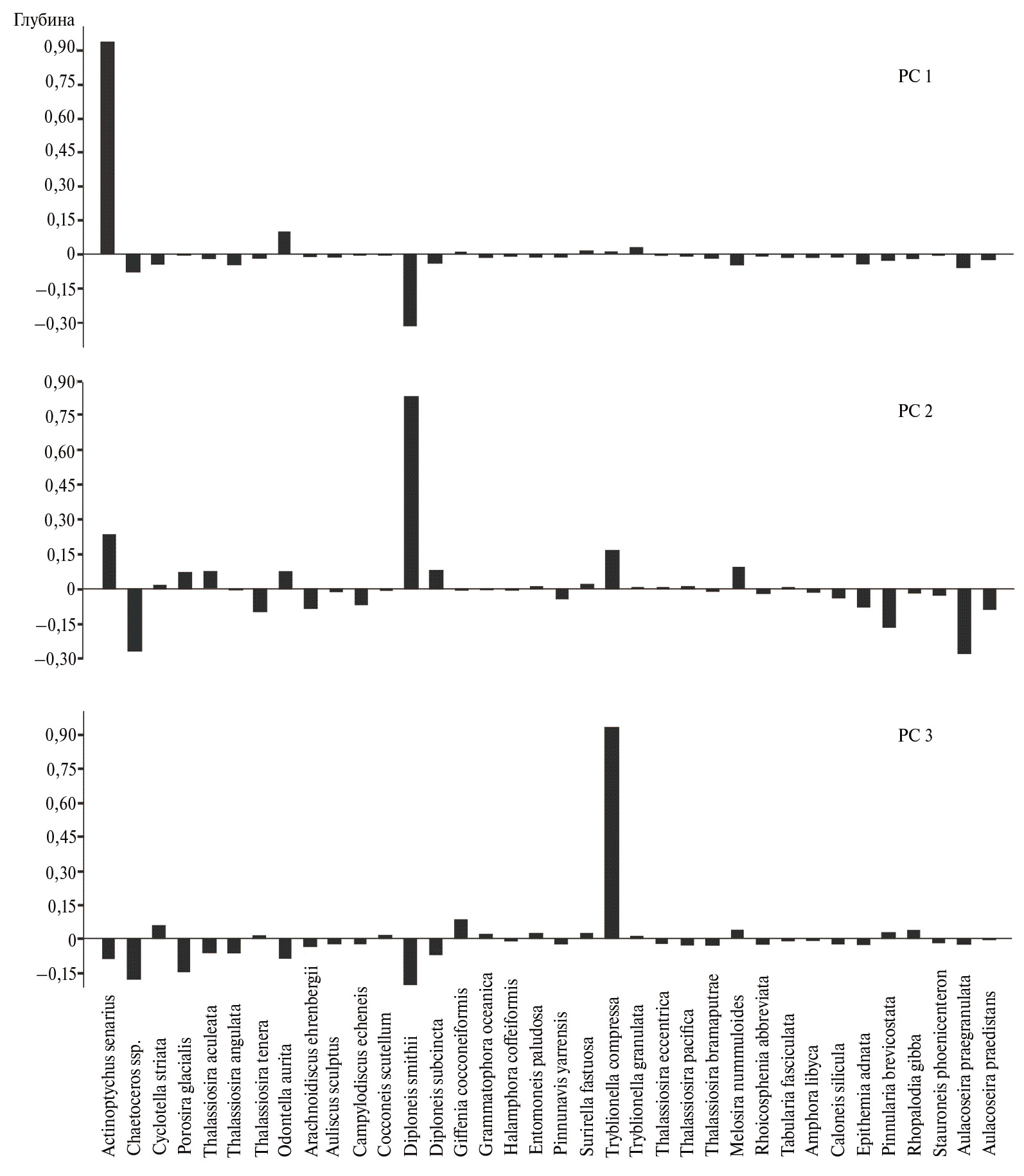 Высокие положительные нагрузки для компоненты 3 имеет морской сублиторальный бентосный вид T. сompressa (0,928), в то время как морские неритические виды Chaetoceros ssp. (–0,176), A. senarius (–0,088), а также морские сублиторальный бентосный D. smithii (–0,198) и планктонный мезогалобный O. aurita (–0,084) имеют отрицательные нагрузки. Хотя вклад РС-3 был низким (9%), тем не менее эта компонента оказалась весьма информативной, поскольку бентосная T. сompressa предпочитает прогреваемые морские мелководья. Можно предположить, что третья компонента отражает условия, характерные для тепловодных прибрежных морских обстановок.