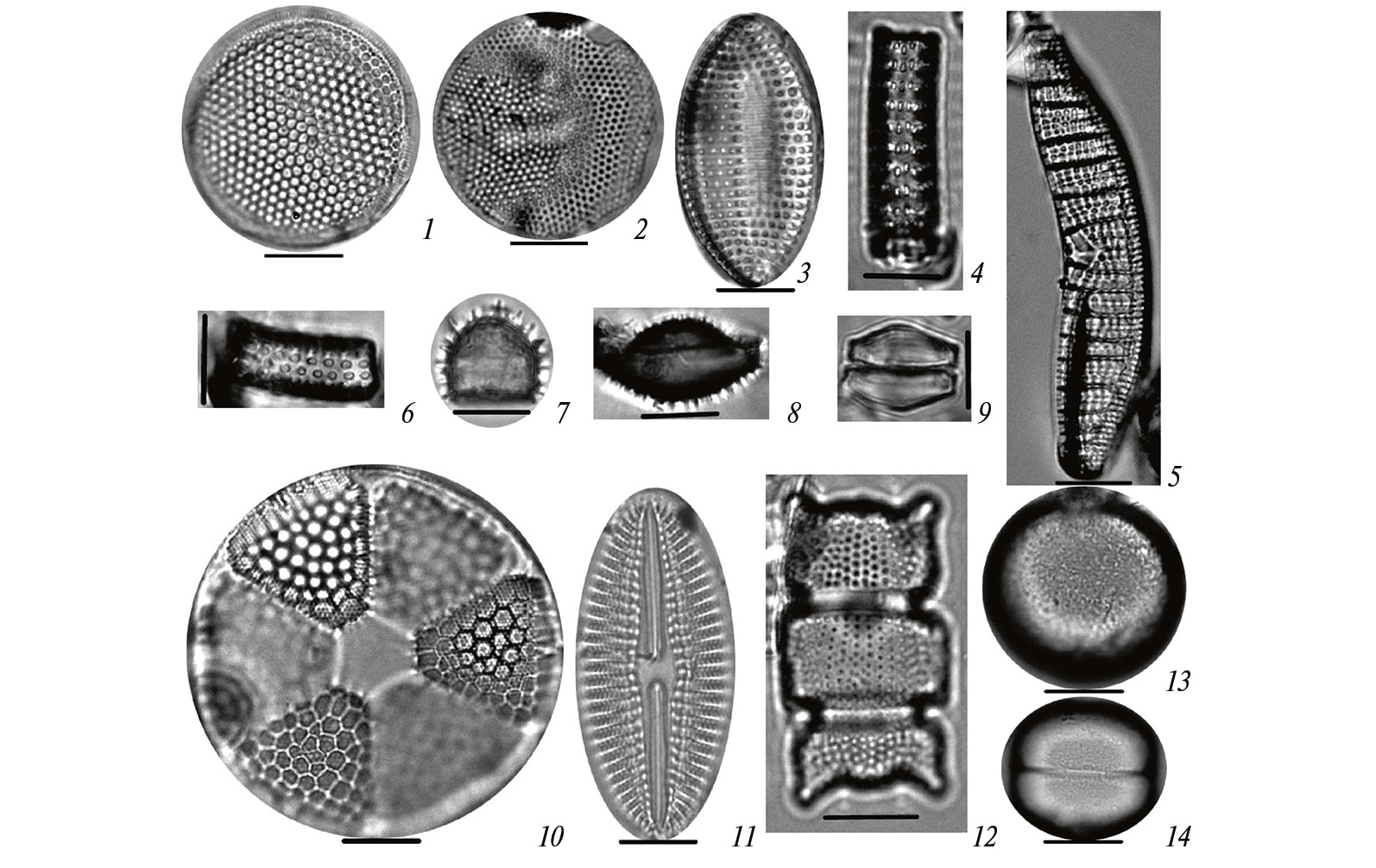 Рис. 4. Виды диатомей с высокими положительными нагрузками в результате PCA: 1 – Thalassiosira angulata (Gregory) Hasle; 2 – Thalassiosira aculeata Proshkina-Lavrenko; 3 – Tryblionella compressa (Bailey) Poulin; 4, 6 – Aulacoseira praegranulata (Jousé) Simonsen; 5 – Epithemia adnata (Kützing) Brébisson; 7–9 – Chaetoceros ssp.; 10 – Actinoptychus senarius Ehrenberg (Ehrenberg); 11 – Diploneis smithi (Brébisson) Cleve; 12 – Odontella aurita (Lyngbye) Agardh; 13, 14 – Melosira nummuloides Agardh. Масштабная линейка – 10 мкм