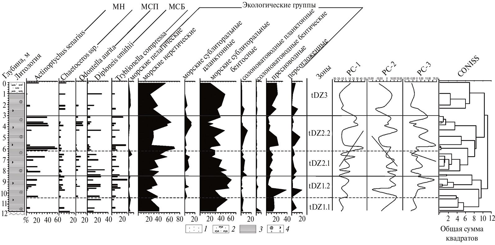 Зона tDZ 2 (1005–460 см) характеризуется максимальными собственными значениями первой компоненты (до 42) и низкими РС-2 и РС-3 (рис. 3). Самые высокие показатели обилия таксонов морской неритический группы (до 70,2%) определяет A. senarius (59,3%), имеющий высокие положительные нагрузки для РС-1. Численность представителей сублиторальной группы снижается (до 50,8%), а вот численность сублиторальных планктонных таксонов возрастает до 13,1%. До 12,9%, увеличивается также обилие представителей солоноватоводных планктонных видов. Отмечается сокращение частоты встречаемости таксонов пресноводных и переотложенных форм (~9 и ~3,8% соответственно). Диатомовый комплекс указывает на активную гидродинамику. Осадки данной зоны характеризуются алевритами.