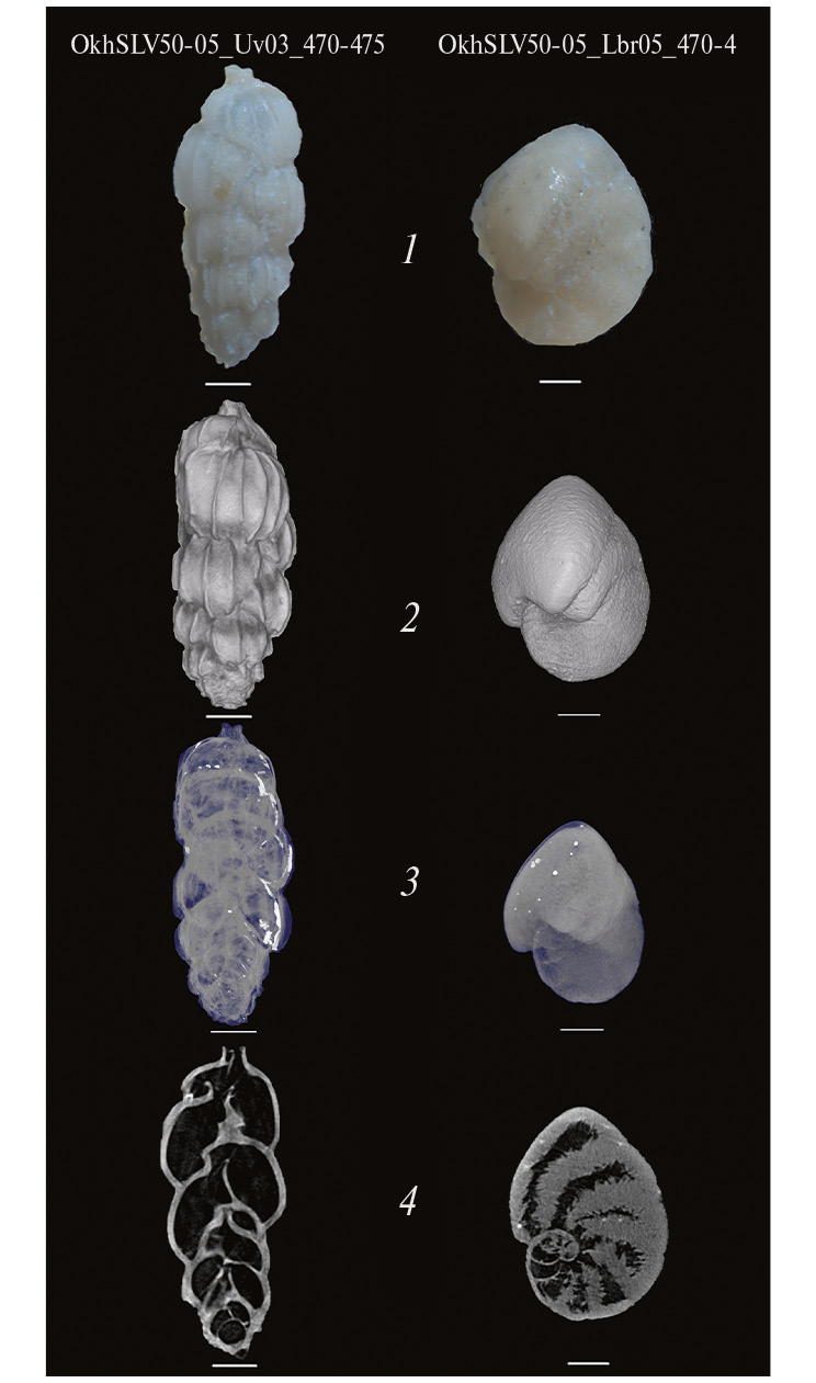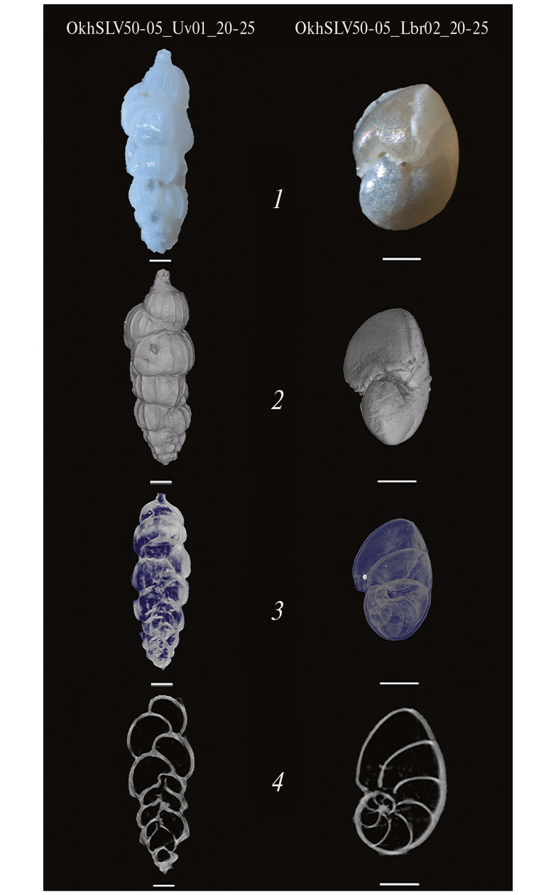 Ранее были определены отрицательные значения δ13C в кальците раковин бентосных фораминифер в колонке донных осадков LV50-05, отобранной в районе активных метановых сипов на восточном склоне о-ва Сахалин в Охотском море. На основе биостратиграфии, значений δ13C в раковинах фораминифер, AMS С14-датировок (ускорительная масс-спектрометрия) в исследуемом районе установлены метановые события (МС) в голоцене: MС-1 (700–900 лет); MС-2 (1200–1400 лет), MС-3 (2500–5400 лет) и MС-4 (7400–10 000 лет) [20]. Первичная диагностика раковин фораминифер и оценка степени зарастания стенок раковин аутигенным карбонатом выполнены с помощью бинокуляра МБС-10. Изображения раковин фораминифер при отраженном свете получены с помощью стереомикроскопа Discovery V12 в лаборатории микро- и наноисследований ДВГИ ДВО РАН. Для проведения микротомографического исследования были отобраны по 5–6 раковин видов Uvigerina parvocostata и Nonionellina labradorica с горизонтов осадков 20–25 и 470–475 см. Раковины фораминифер хорошей сохранности, отобранные в горизонте 20–25 см, подобны раковинам живых фораминифер. Раковины фораминифер из горизонта 470–475 см характеризуются наибольшей степенью обрастания аутигенным карбонатом. Для раковин данного горизонта зафиксированы аномально низкие значения δ13С [22].