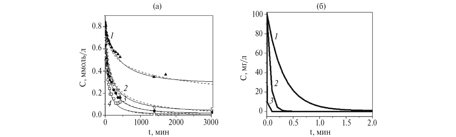 Рис. 3. Кинетические кривые сорбции ионов Cu(II) на гранулах ПЭИ при отношении сорбент : раствор 1:1000 (4), 1:1500 (3), 1:2000 (2), 1:4000 (1): точки – экспериментальные данные; пунктирные линии - модель РКС, сплошные линии - модель РКС-Д (а). Модельные кинетические кривые сорбции ионов Cu(II), полученные с применением модели РКС и РКС-функции для гранул (1) и мелкой фракции (2) и модели РКС-Д и РКС-функции для мелкой фракции ПЭИ (3); параметры для моделирования (масса сорбента, объем колонки, концентрация адсорбата) соответствуют условиям сорбции в динамике на рис. 2, а (б)