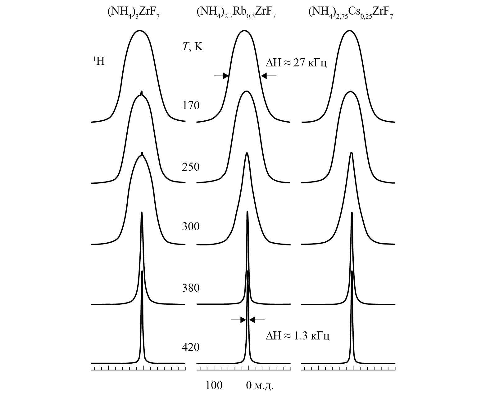 Результаты исследований изоструктурных (NH4)3ZrF7 твердых растворов (NH4)2,4Rb0,6ZrF7, (NH4)2,7Rb0,3ZrF7 и (NH4)2,75Cs0,25ZrF7 указывают на заметные отличия в динамическом состоянии ионов в последних по сравнению с исходным соединением [45, 46]. Как можно видеть из рис. 1, этап развития реориентаций ионов ZrF73– завершается для твердых растворов раньше по сравнению с исходным соединением. Аналогично начало трансляционных движений иона аммония и переход спектров к диффузионному сужению происходит для твердых растворов при более низких температурах.