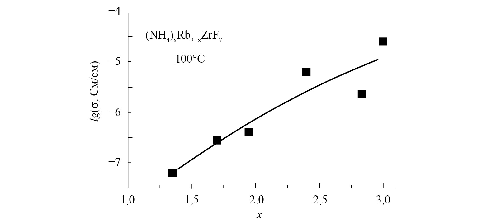 Установлено, что соединения состава (NH4)xRb3-xZrF7 обладают относительно высокой ионной проводимостью (σ ≥ 5·10–5 См/см при 420 K). Величина проводимости возрастает с ростом концентрации ионов аммония (рис. 2). Увеличение концентрации ионов рубидия приводит к исчезновению фазового перехода и падению проводимости. Добавление более крупных катионов цезия приводит к увеличению параметра решетки, и, несмотря на уменьшение числа носителей заряда, облегчает протекание ФП и ионного транспорта. Электропроводность соединений Cs0,25(NH4)2,75ZrF7 и Rb0,3(NH4)2,7ZrF7 при высоких температурах превосходит электропроводность (NH4)3ZrF7.