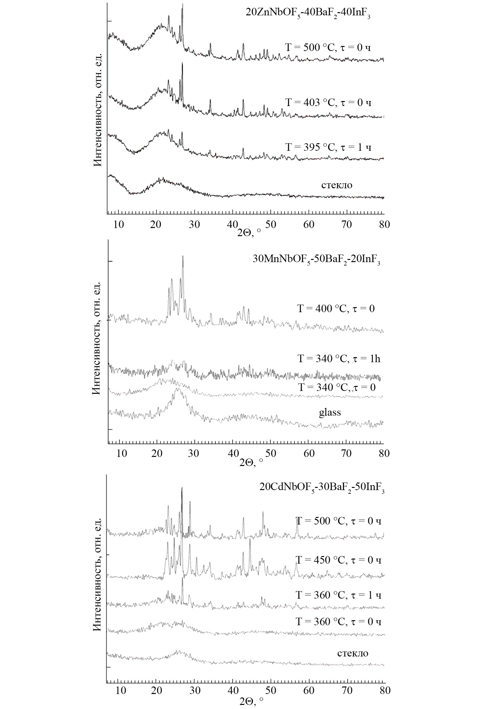 Важным результатом является то, что, по данным изучения дифрактограмм стекол всех обсуждаемых систем, при нагреве после появления в стекле кристаллических фаз образец в целом остается аморфным (рис. 2). Этот результат указывает на возможность получения прозрачных стеклокерамик в стеклах системы MNbOF5-BaF2-InF3 путем термообработки. Для их получения необходимо тщательное наблюдение за процессом кристаллизации, чтобы при начале кристаллизации внутри образца остановить нагревание на требуемой стадии. Оксифторидные стеклокерамики являются уникальными материалами. Как правило, стеклокерамики обладают лучшими механическими и термическими свойствами [25] и в нашем случае легко могут быть получены при термической обработке исходных стекол. На рис. 2 наглядно проиллюстрирована возможность получения стеклокерамик, режимов получения стеклокерамик, получение стеклокерамик заданного состава.