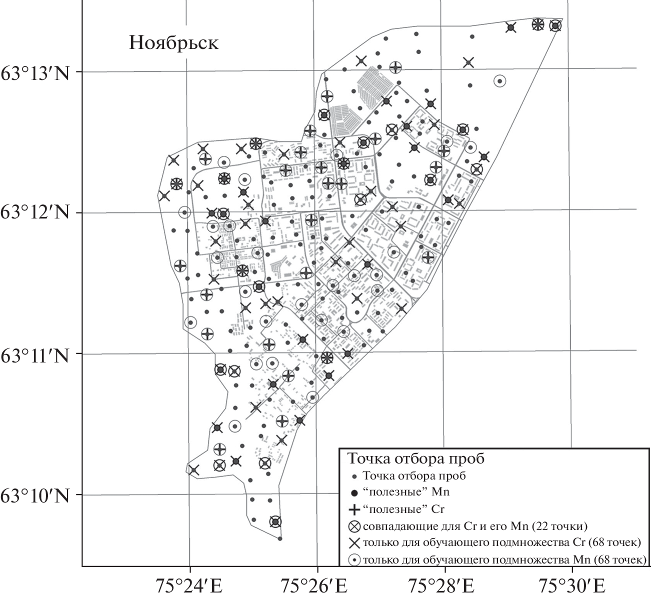The selection of a method for dividing the raw data into training and test subsets in models based on artificial neural networks (ANN) is an insufficiently studied problem of continuous space-time field interpolation. In particular, selecting the best training subset for modeling the spatial distribution of elements in the topsoil is not a trivial task, since the sampling points are not equivalent. They contain a different amount of “information” in point of each specific model, therefore, when modeling, it is advisable to use most of the points containing information which is “useful” for this model. Incorrect data division may lead to inaccurate and highly variable model characteristics, high variance and bias in the generated results. The raw data included contents of chromium (Cr) and manganese (Mn) in the topsoil in residential areas of Noyabrsk (a city in Russian subarctic zone). A three-stage algorithm for extracting raw data with a division into training and test subsets has been developed for modeling the spatial distribution of heavy metals. According to the algorithm, the initial data set was randomly divided into training and test subsets. For each training subset, an ANN based on multilayer perceptron (MLP) was built and trained. MLP was used to model the spatial distribution of heavy metals in the upper soil layer, which took into account spatial heterogeneity and learning rules. The MLP structure was chosen by minimizing the root mean square error (RMSE). The networks with the lowest RMSE were selected, and the number of hits into the training subset of each point in space was calculated. By the number of hits in the training subset, all points were divided into three classes: “useful”, “ordinary” and “useless”. Taking this information into account, at the stage of the raw data division it possible to increase the accuracy of the predictive model.