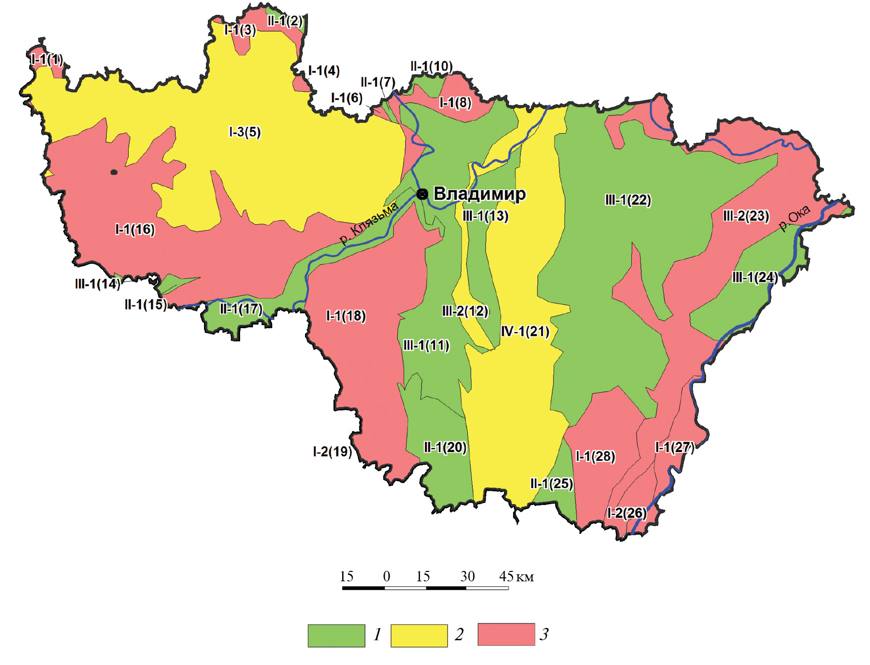 Рис. 2. Карта-схема благоприятности территории Владимирской обл. для размещения ТКО по грунтовым условиям. Условные обозначения: 1 — благоприятные, 2 — условно благоприятные, 3 — неблагоприятные. Цифры в скобках — номера районов.