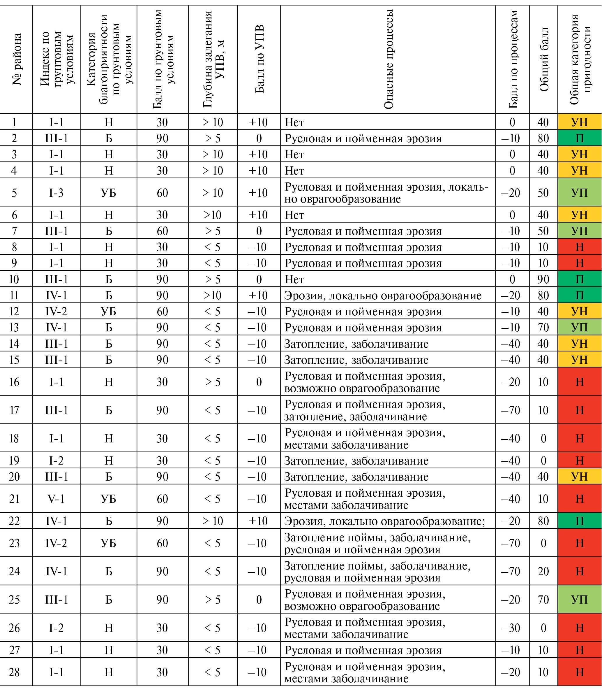 Исходя из геоморфологического положения участков, оценивалась возможность проявления: заболачивания, подтопления, затопления поймы паводковыми водами, русловой и пойменной эрозии, овраго- и оползнеобразования. С учетом литологического состава пород и строения геологического разреза, а также имеющихся сведений о наличии карстово-суффозионных провалов, оценивалась возможность развития сульфатного и карбонатного карста [2, 4, 6]. Все эти позиции также выражались в понижающих баллах, присваиваемых участку (см. табл. 2). Значения баллов назначались на основании общих сведений о площади, подверженной развитию того или иного процесса, его интенсивности (разрушительной силы) и повторяемости. В случае развития на одном участке нескольких опасных процессов баллы либо суммировались, либо участку присваивался балл по наиболее опасному процессу, исходя из общих экспертных оценок.