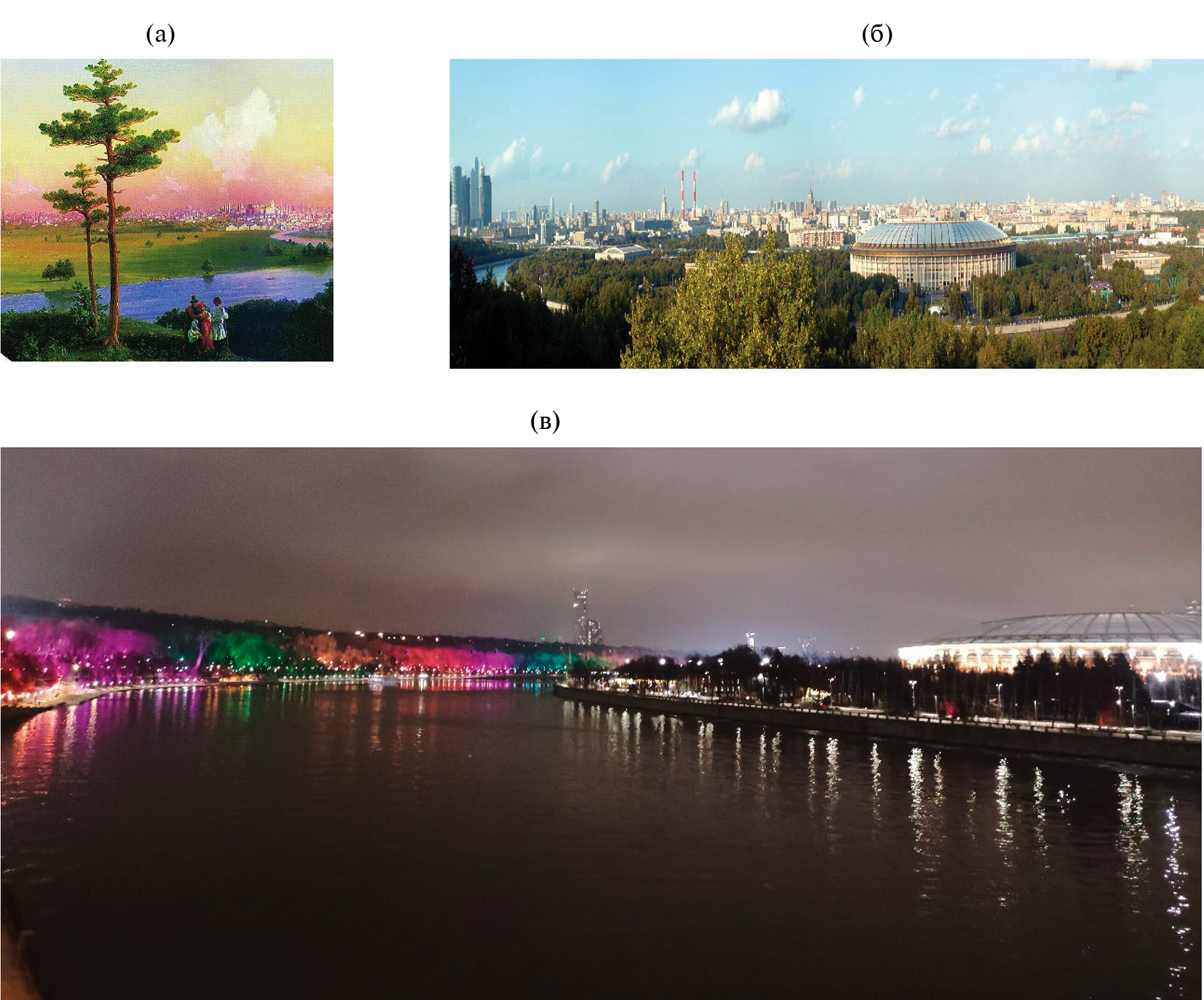 Рис. 1. Визуальная ретроспектива динамики геосистем ООПТ в районе Лужнецкой излучины р. Москва: а − в XIX в. (по картине И.К. Айвазовского, 1848) [1], б − в ХХI в. [8], в − фотофиксация склона Воробьевых гор с метромоста (Т.А. Барабошкина, 2023).