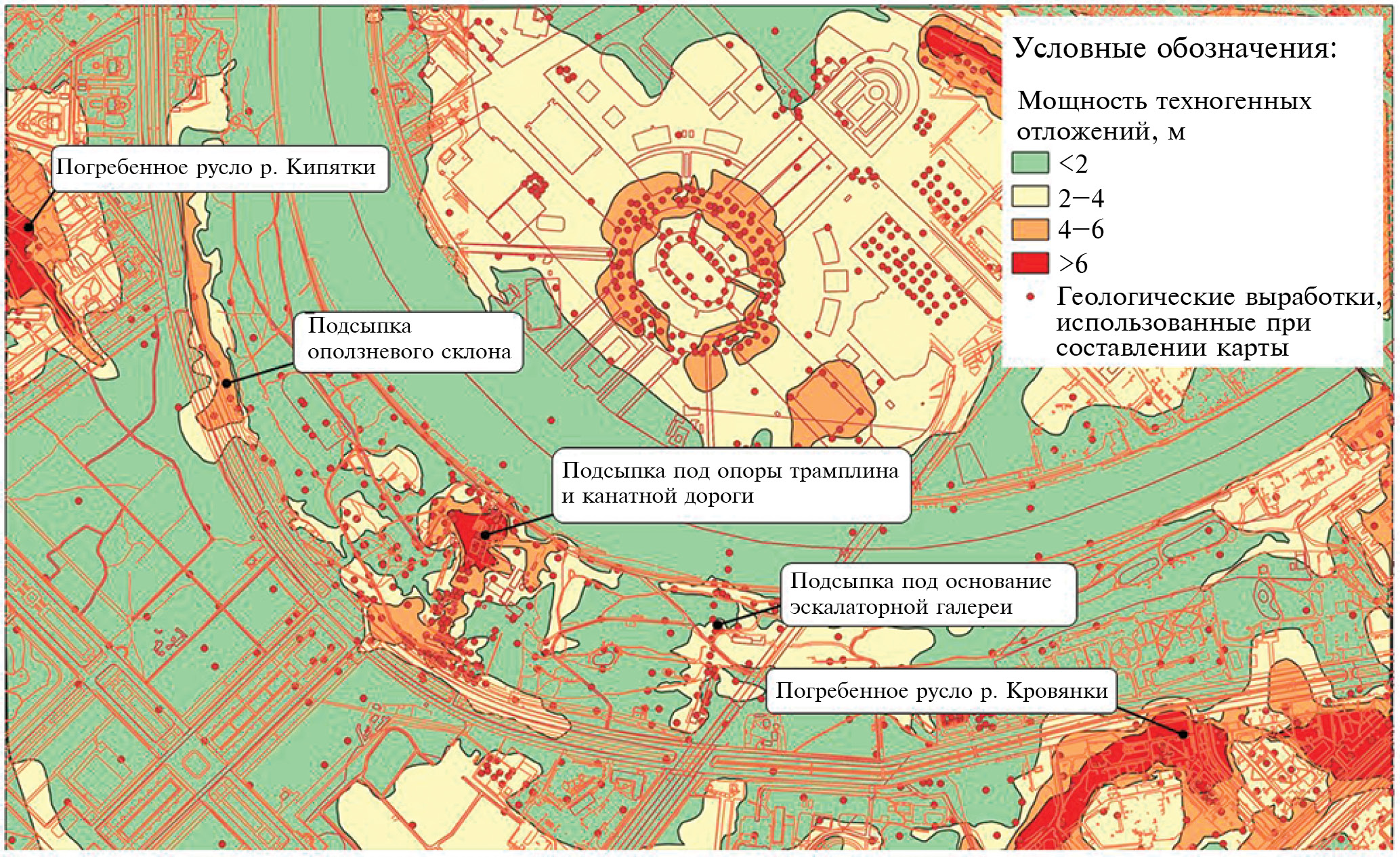 При построении карты-схемы были систематизированы подборка геологических выработок и результаты топографической съемки за период с начала 1930-х гг. до нашего времени. В частности, анализируемая территория была существенно изменена при строительстве горнолыжного трамплина, канатной дороги, эскалаторной галереи и других сооружений, а также при укреплении бровки оползневого склона, а на прилегающей территории — при засыпке долин малых рек Кровянка и Кипятка.