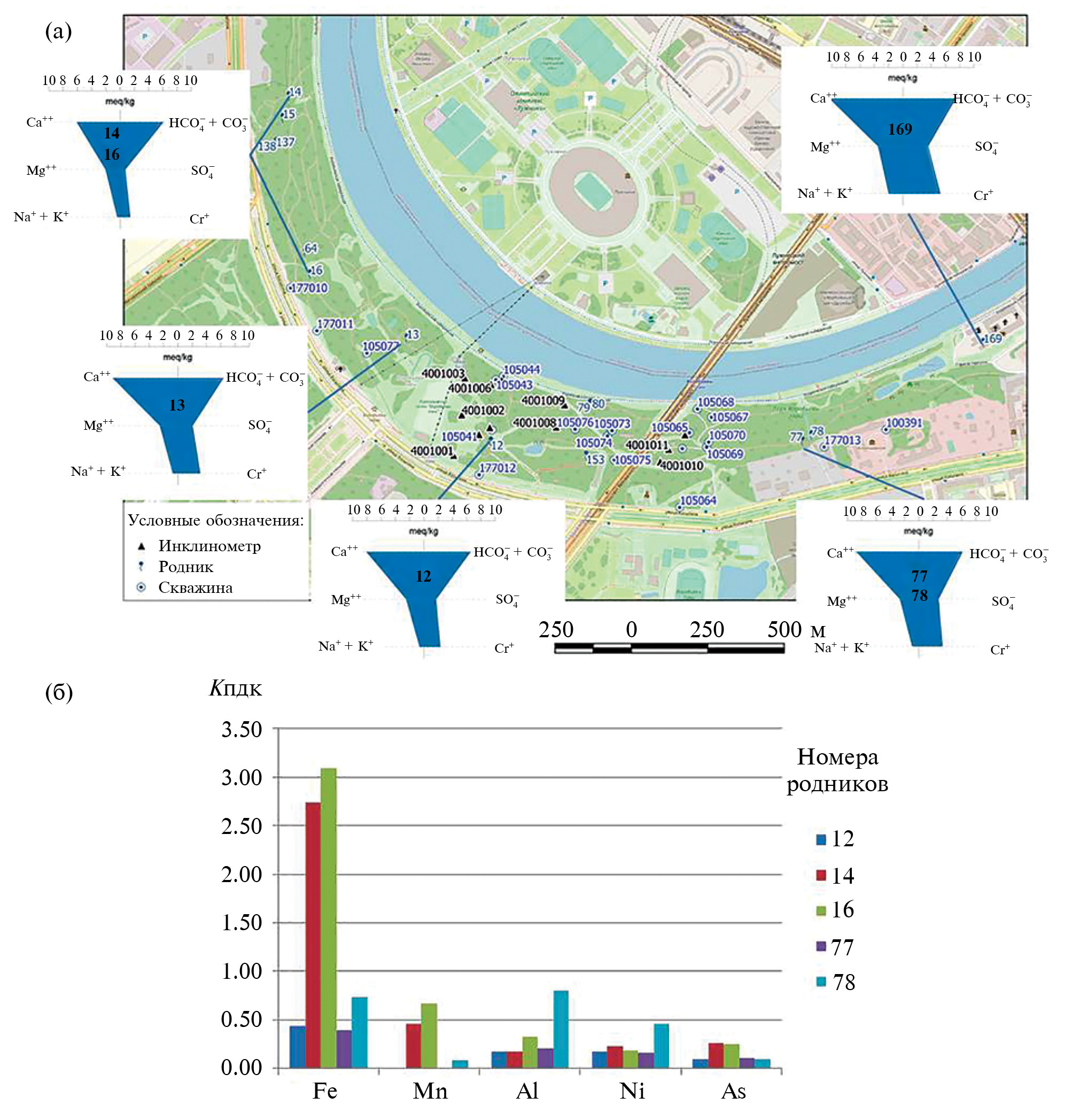 Рис. 5. Интегральная схема местоположения пунктов мониторинга по данным ГПБУ “Мосэкомониторинг” и диаграммы Стиффа [31] макрокомпонентного состава вод родников (а); содержание микроэлементов (в значениях Кпдк) в воде родников, изученных в 2022 г. (б).