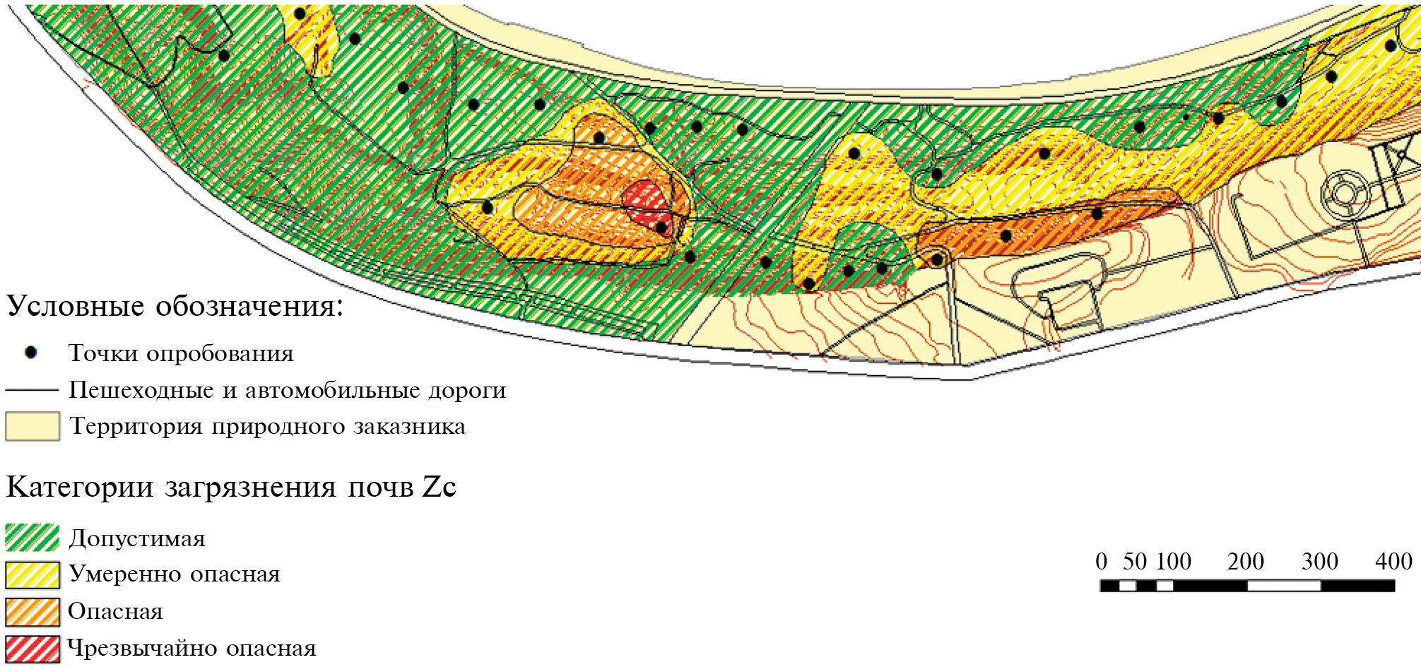 Анализ уровня загрязнения почв по величине суммарного показателя загрязнения (Zc) показал, что большинство изученных проб с территории заказника относится к допустимой категории загрязнения. За исключением локального аномального участка (100 м к западу от нижней станции метрополитена) в районе насыпного техногенного массива с повышенной влажностью (Zc = 134), образованного на этапе реконструкции станции метрополитена. Интегральная оценка выполнена на базе принципа доминанты наихудшего показателя по итогам анализа данных по абиотическим (почвы) и биотическим компонентам (листья клена) геосистем.