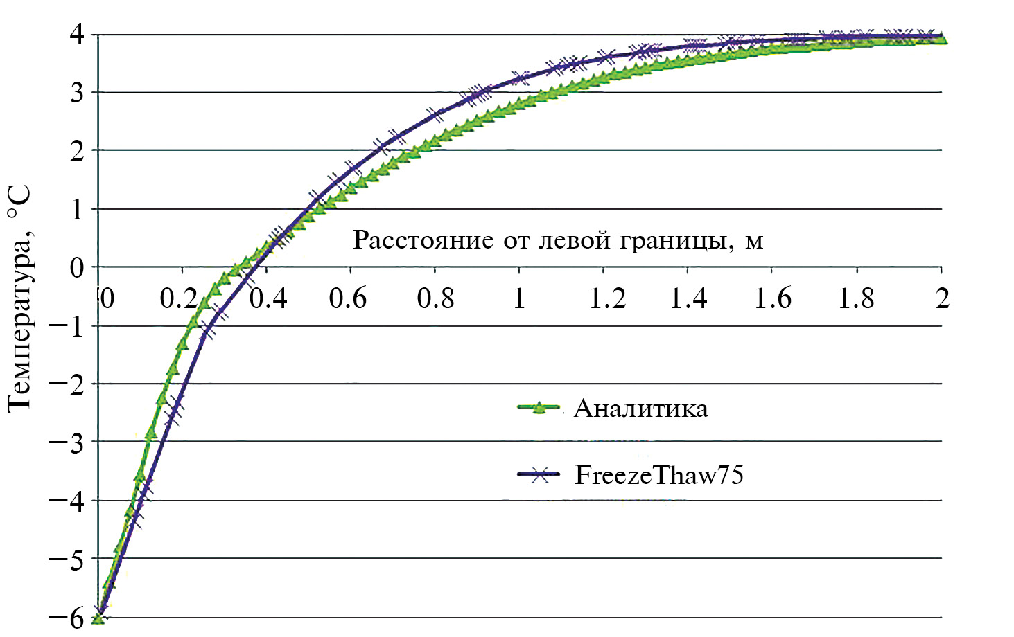 На рис. 1 приведена постановка этой задачи. Изначально в горизонтальной модельной области задана температура +4°C. На левой границе задана постоянная температура –6°C, приводящая к постепенному промерзанию. В аналитической модели оцениваются термодинамическое влияние левой границы и распространение промерзания во времени. На рис. 2 приведено сопоставление расчетов на основе модуля FreezeThaw75 с аналитическим решением на момент времени 1 сут.