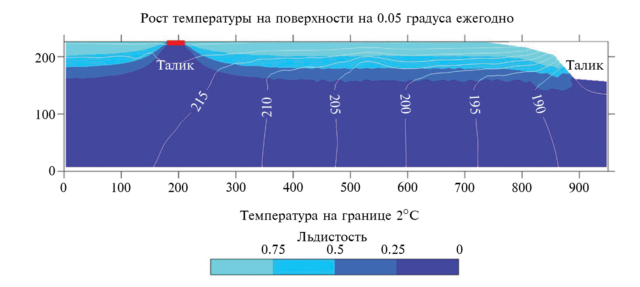 Рассматриваемая область тестовой модели предполагает начальное распределение уровней согласно рельефу (верхняя граница модели) (рис. 4). Рельеф участка имеет пологий уклон к реке на юго-восток. Основание и вертикальные стороны модели представляют собой непроницаемые фильтрационные границы. В основании модели (т.е. ниже подошвы ММП) была задана постоянная температура +2°C. Вертикальные границы непроницаемы для теплопереноса. На верхней границе задано увеличение температуры на дневной поверхности на 0.05°C ежегодно в течение 100 лет. Начальное распределение таликов, уровней и мощности зоны ММП было задано исходя из данных мониторинга. Над таликом на поверхности в левой части задан источник в виде концентрации 100 мг/л.