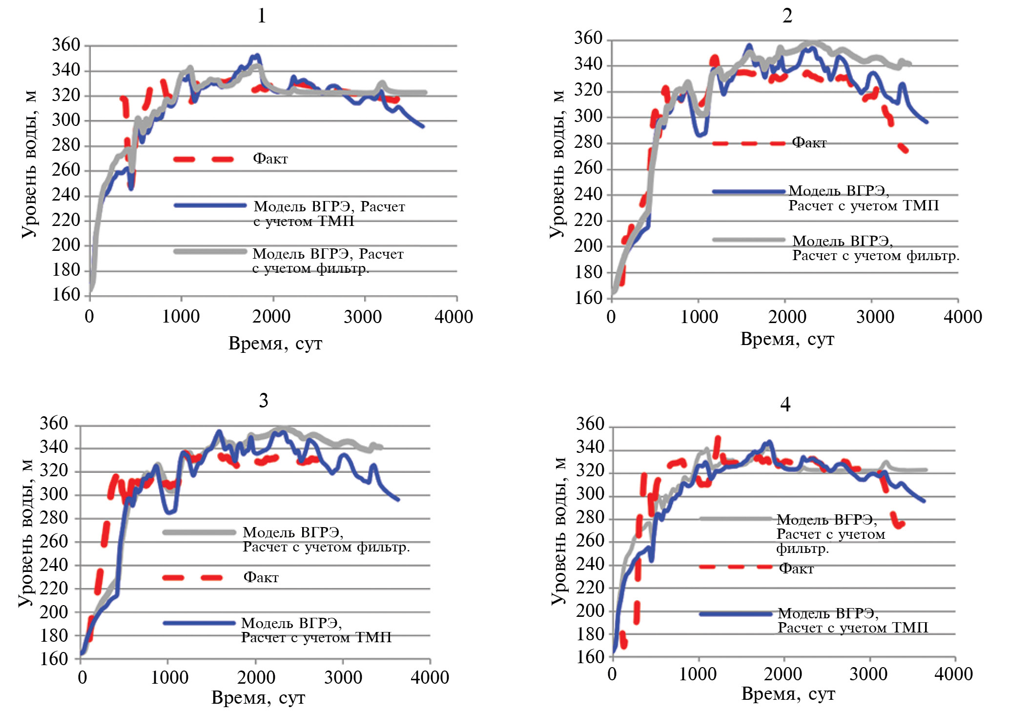 Рис. 8. Сопоставление фактических и расчетных уровней по ближайшим к закачным скважинам пьезометрам №№ 1–4.