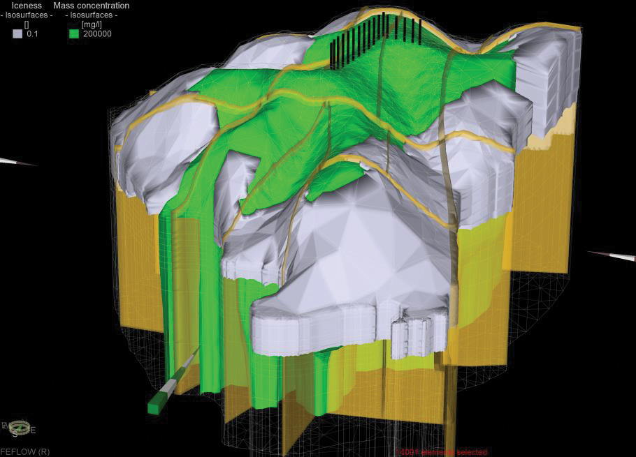 Для модельного обоснования закачки рассолов применялись два подхода. Первый, наиболее простой, основан только на фильтрационной модели с параметрами, полученными по результатам мониторинга на объекте. Второй, более сложный, предполагает совместное использование модели геофильтрации и тепломассопереноса с фазовыми переходами.
