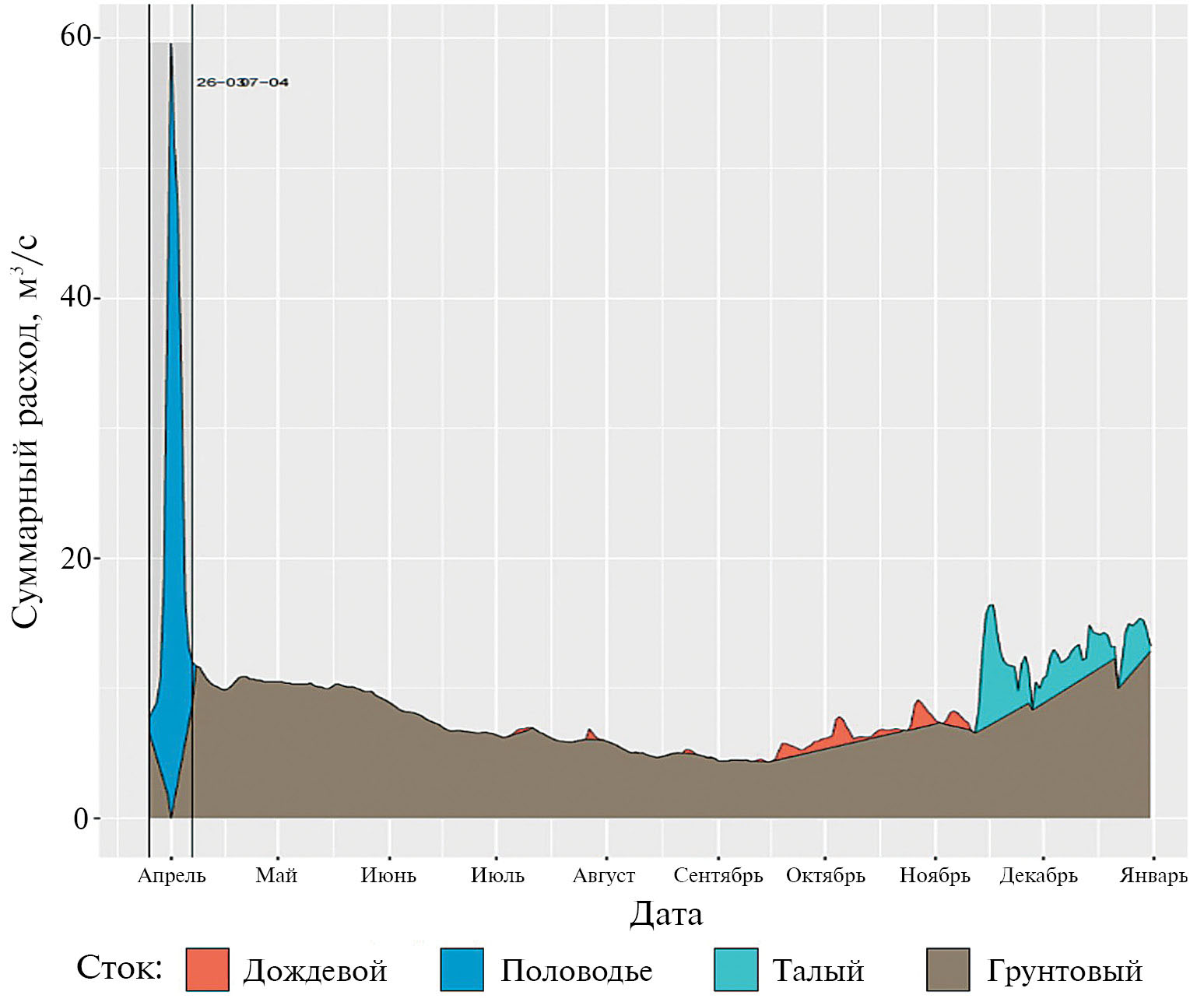 Для анализа водного режима рек и их источников питания проводят расчленение гидрографа на генетические составляющие, представляющие собой стоки разного типа. Расчленение гидрографа позволяет определить суммарную величину подземного и паводочного стока. Типовой гидрограф представляет собой линию, описывающую пик половодья, кривые его спада и подъема, летнюю и зимнюю межень. Площадь под этой линией определяет объем подземного и поверхностного стока [10].