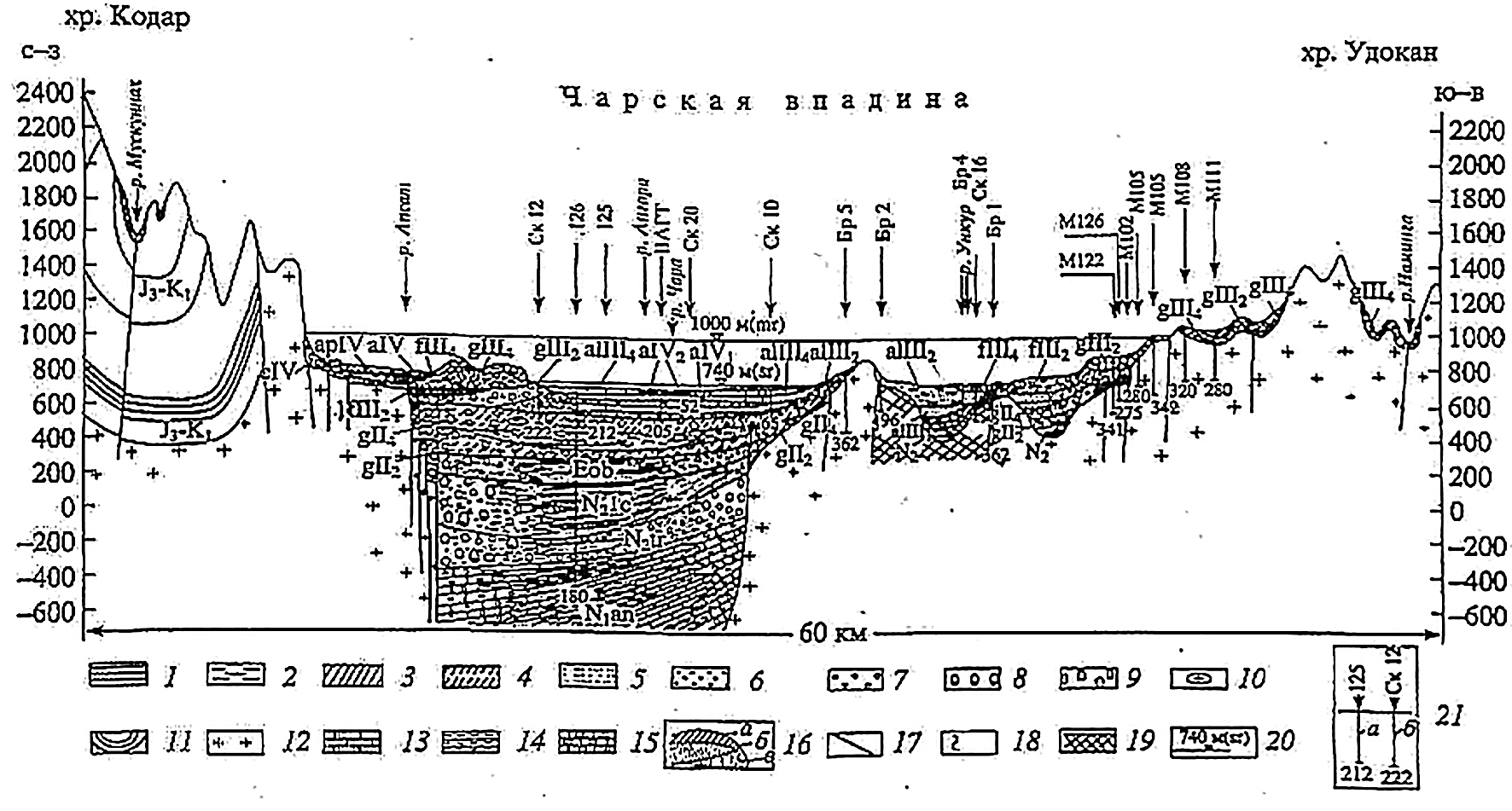 Рис. 1. Геологический разрез Чарской впадины [3]. 1 – глина, алеврит; 2 – отложения пылеватые; 3 – суглинок; 4 – супесь; 5 – песок; 6 – гравий; 7 – галька; 8 – валуны; 9 – дресва, щебень, глыбы; 10 – отторженец; 11 – мезозойские осадочные отложения (Апсатская мульда); 12 – кристаллические породы фундамента; 13 – песчаник; 14 – алевролит; 15 – конгломерат; 16 – конечная морена (а – абляционная, б – ребристая, в – напорная); 17 – тектоническое нарушение; 18 – сейсмодислокация; 19 – участок разреза вдоль зоны разлома; 20 – абсолютные отметки уровня ледниково-подпрудного озера (sr – сартанской эпохи, mr – муруктинской эпохи); 21 – скважина. Цифры: вверху – номер, внизу – глубина в метрах (а – скважина в плоскости разреза, б – спроектированная на плоскость разреза).
