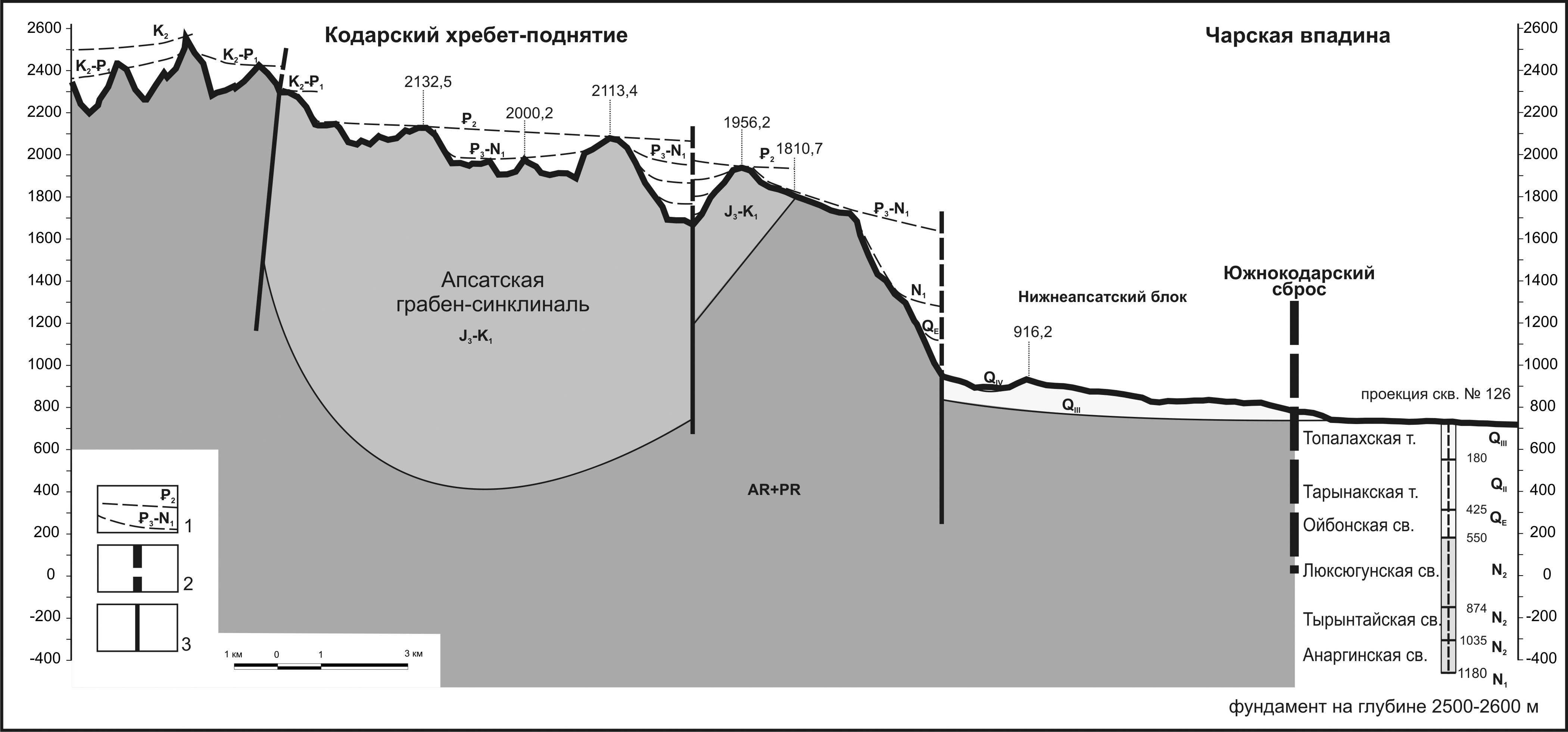 Рис. 2. Геолого-геоморфологический профиль (по линии А–Б, рис. 3). Сочленение Кодарского хребта-поднятия с Чарской рифтовой впадиной. 1 – геоморфологические уровни; 2–3 – новейшие разрывы: 2 – региональные, 3 – локальные.
