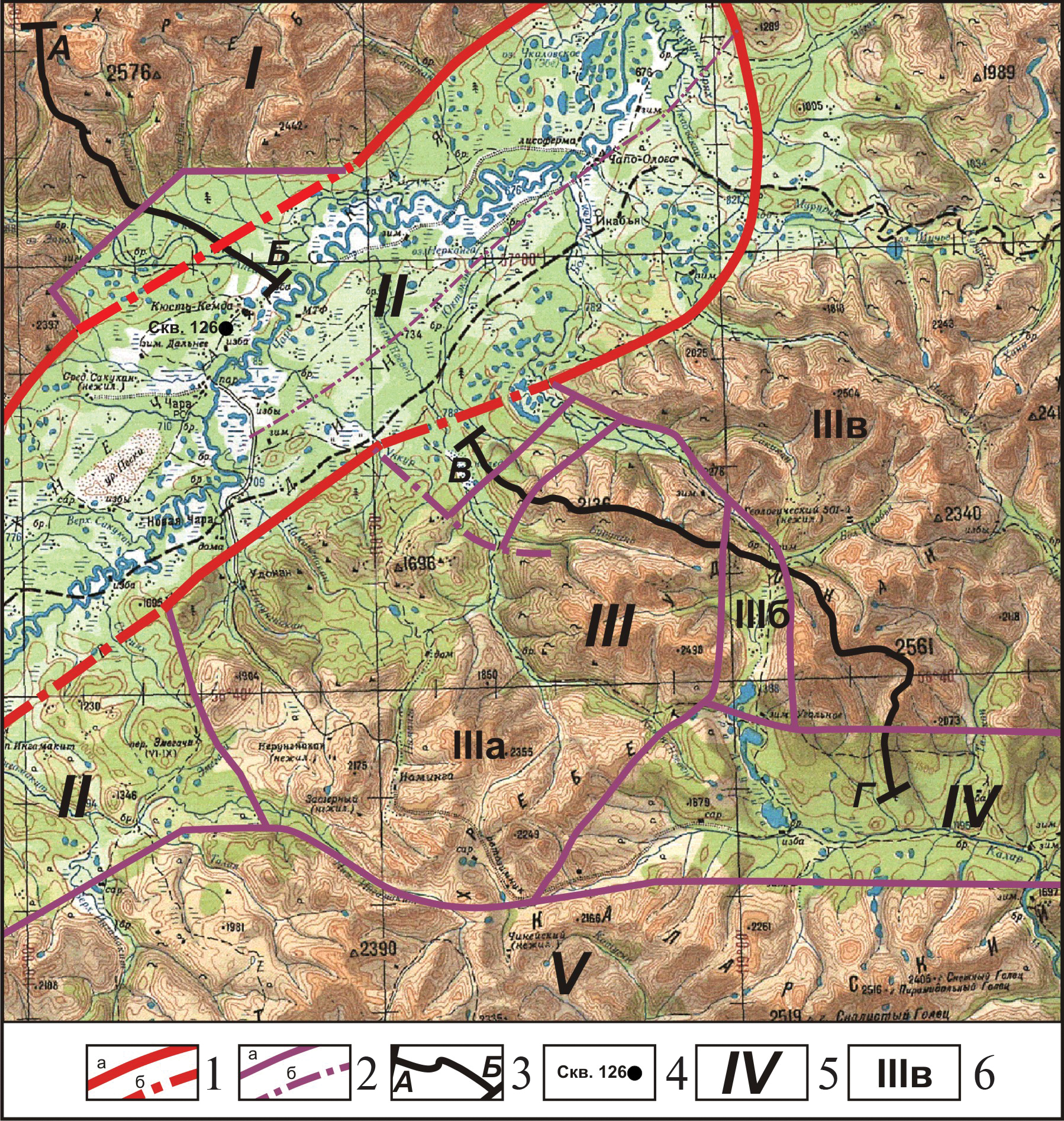 Рис. 3. Схема неоструктурного районирования центральной части Чарской впадины и смежных хребтов-поднятий. 1–2 – разрывы (а – достоверные, б – предполагаемые): 1 – региональные, 2 – локальные; 3 – линии геолого-геоморфологических профилей (А–Б – см. рис. 2, В–Г – см. рис. 4); 4 – скважина № 126; 5–6 – индексы блоковых структур: 5 – региональных, 6 – локальных.