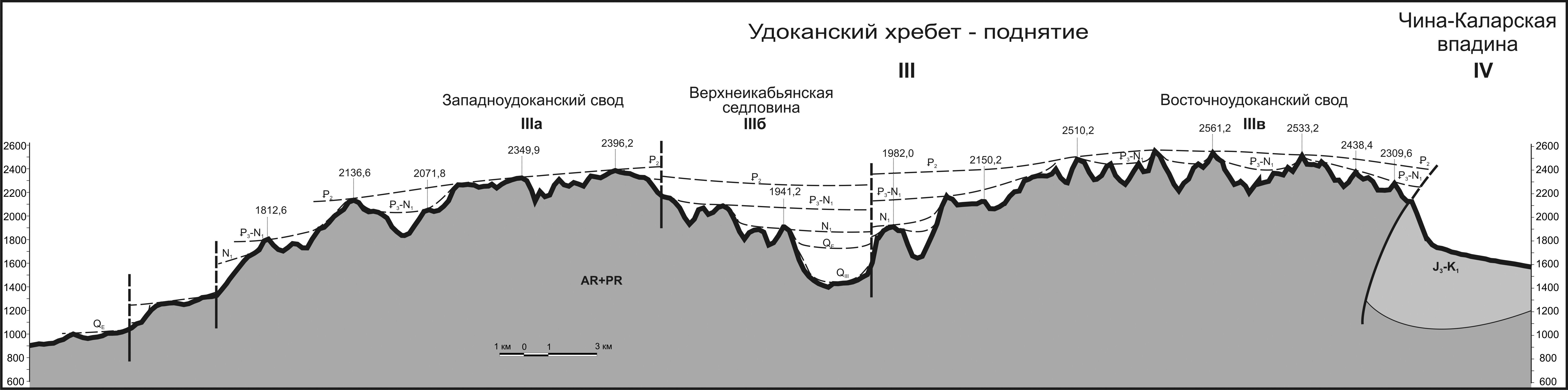 Удоканский хребет-поднятие (III) обрамляет Чарскую впадину с юга и востока. В рассматриваемый район попадает западная его часть, расположенная между Среднеингамакитским опущенным блоком и Чина-Каларской впадиной. В пределах этой части хребта-поднятия выделяются Западноудоканский (IIIа) и Восточноудоканский (IIIв) своды, разделенные Верхнеикабьянской (IIIб) седловиной. Западный борт этой седловины осложнен малоамплитудным сбросом (рис. 4).