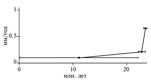 Сопоставление этих скоростей, очевидно, свидетельствует об их существенном нарастании в неоплейстоцене (рис. 7). Это соответствует общим тенденциям во многих других орогенах, в том числе высокоактивных альпийских [9, 10]. Данная закономерность, вероятно, свойственна и другим наиболее активным региональным разрывам в БРЗ.