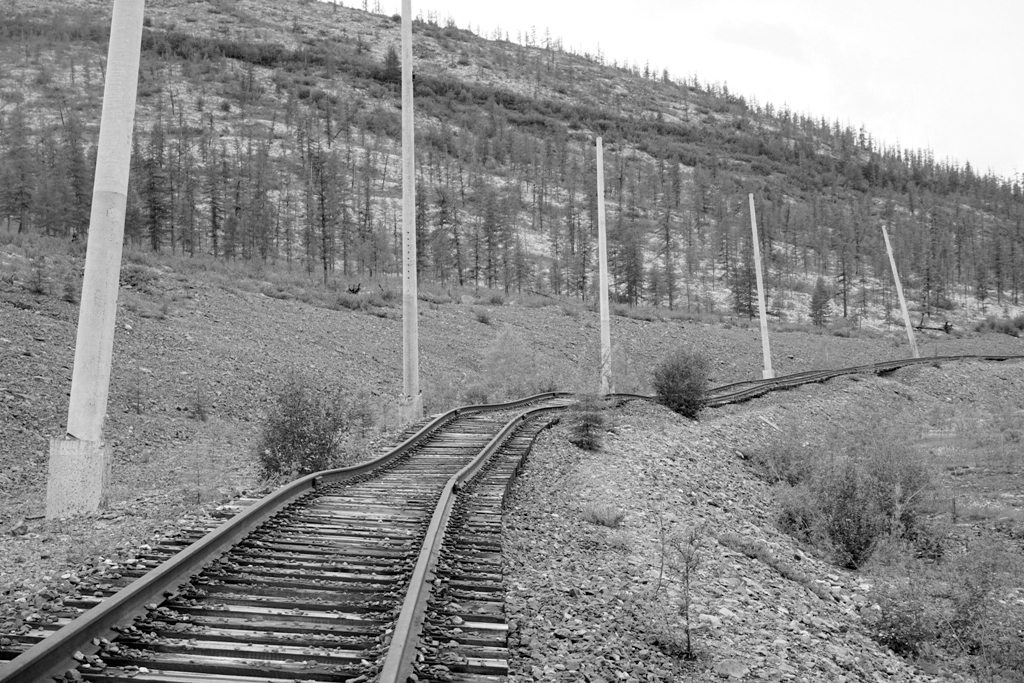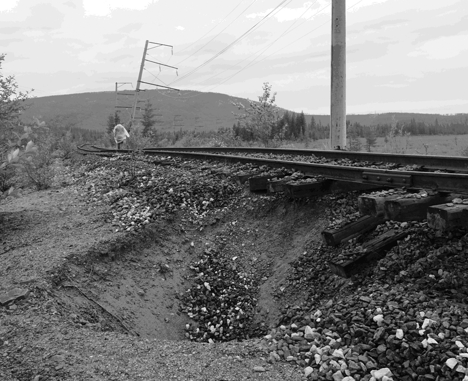 Рис. 15. Волнообразные просадки участка железнодорожной ветки Новая Чара – Чина (68-й километр дороги), вызванные термокарстовым процессом (фото А. Кулакова).