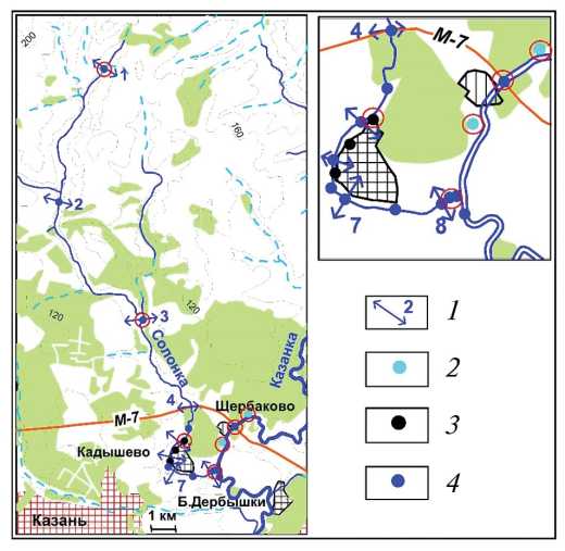Рис. 2. Карта фактического материала: 1 – гидростворы и их номера; 2–4 – пункты опробования: 2 – оз. Голубые, 3 – восходящих родников, 4 – вод рек Солонка и Казанка. Гидропробы с пунктов опробования, обведенных красной окружностью, проанализированы на ICP-MS.