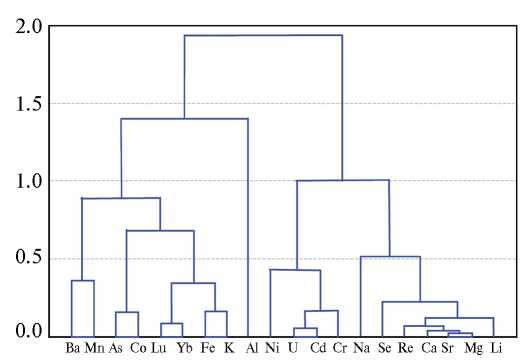 Макрокомпонентный состав вод Голубых озер, рек Казанка, Солонка и родников в долине последней изучается длительное время, и он хорошо известен. К сожалению, это не относится к их микрокомпонентному составу, литературные данные по которому крайне немногочисленны и включают концентрации единичных элементов. Из 53 вышеуказанных элементов, характеризующихся значимыми (ненулевыми) содержаниями по данным масс-спектрометрии с индуктивно связанной плазмой, 20 можно использовать в геохимических целях, так как они испытывают некоторое концентрирование в определенных типах природных вод (рис. 3, здесь Ca, Mg, Na и K отнесены к микрокомпонентам условно, кластер-диаграмма подтверждается и результатами факторного анализа). Остальные 33 элемента отличаются индифферентным поведением.