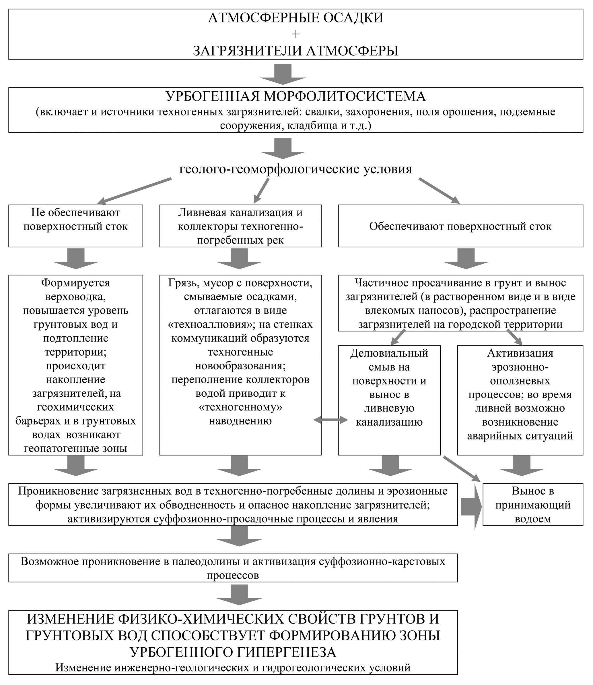 Геоморфологический каркас организует поверхностный и подземный сток в водосборные бассейны. Инженерно-строительный каркас и техногенные водонесущие коммуникации объединяют, загрязняют, смешивают воды разных водосборных бассейнов и геоморфологических районов, концентрируют стоки в каком-либо одном месте, не всегда связанном со структурой природных бассейнов. За счет перестройки связей и границ нередко происходит слияние разнородных геоморфологических систем, в том числе биогеоценозов; поглощение и трансформация существующих и возникновение на их месте природно-антропогенных систем с унаследованными, или чаще, “природоподобными” свойствами и структурой.