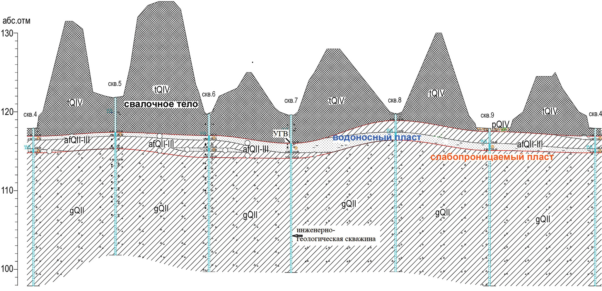 Общая мощность четвертичных отложений около 20 м. Максимальная мощность свалочного тела 21 м. Коренные отложения до глубины 40 м не вскрыты (по литературным источникам, они представлены среднеюрскими глинами келловейского яруса мощностью порядка 13–15 м (J2k), под которыми залегают верхнекаменноугольные известняки (С3)).