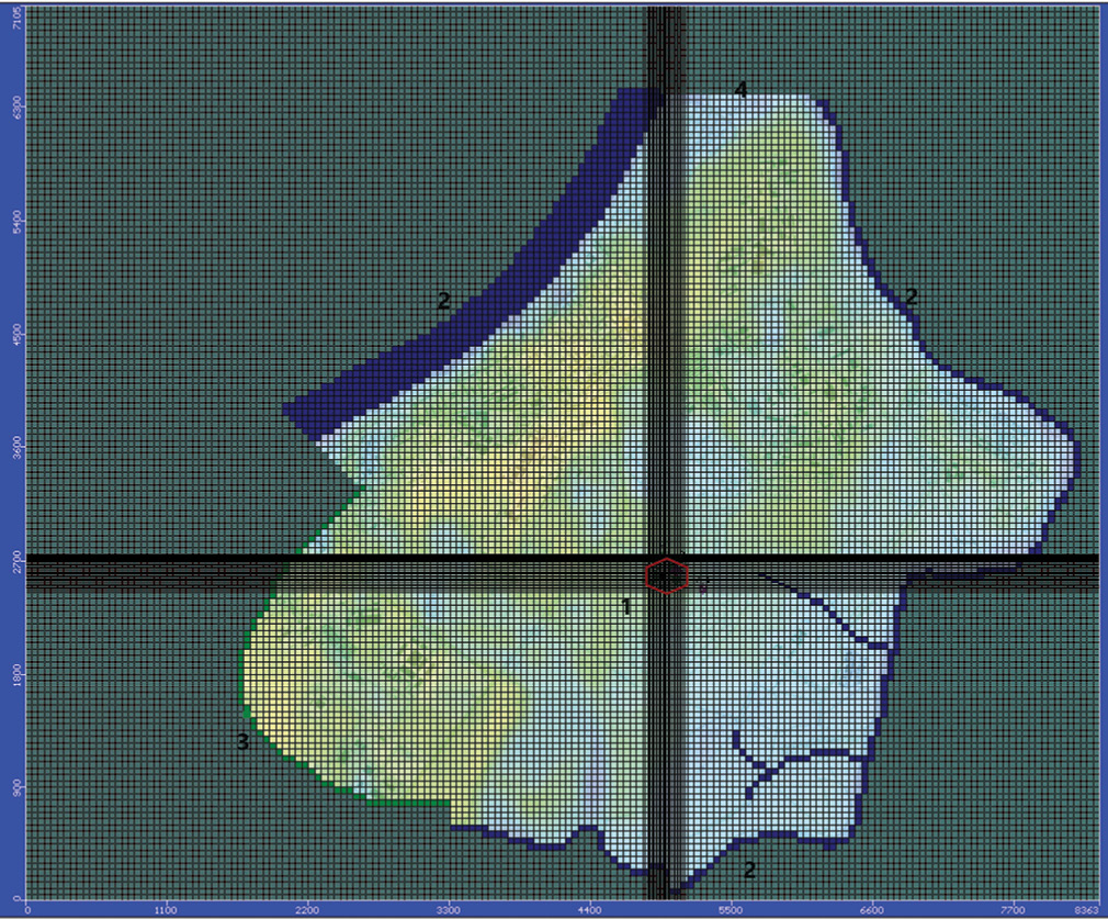 Рис. 3. Расчетная область модели: 1 – полигон ТБО; 2 – водотоки; границы: 3 – южная; 4 – северная.
