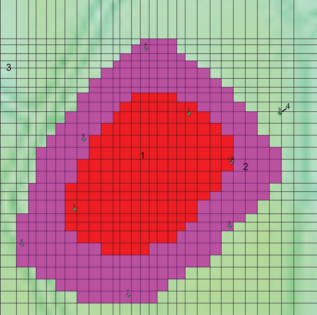 Рис. 4. Зоны инфильтрационного питания (мм/год): 1 – 390; 2 – 100; 3 – 60, 4 – скважина и ее номер.