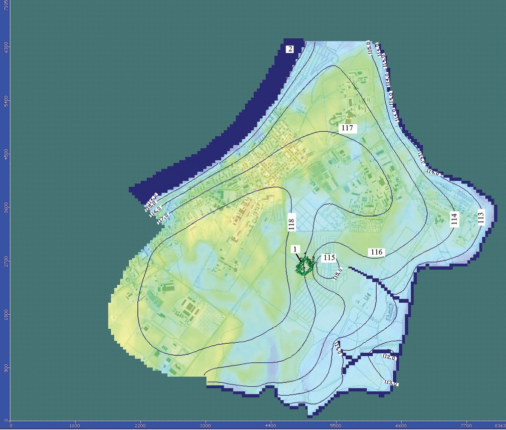 Геофильтрационная схематизация гидрогеологических условий для реализации первого сценария выглядит следующим образом. Рассматривается стационарный пространственный поток в двухслойной системе: плановый в водоносном пласте в аллювиально-флювиогляциальных песках и вертикальный в слабопроницаемом пласте в моренных суглинках (рис. 2). Размеры расчетной области в плане составили 7 × 6 км. В качестве естественных внешних и внутренних границ потока задавались водотоки (рис. 3). Взаимодействие подземных и поверхностных вод реализовывалось заданием граничного условия (ГУ) III рода при помощи модуля River. На севере моделируемая область была обрезана по линии тока, на юге ограничена по линии равного напора 117 м в абсолютных отметках, на которой было задано ГУ III рода, позволяющее при помощи расчетного модуля GHB реализовывать выходящий из расчетной области расход подземных вод. Таким образом, границы области фильтрации находятся на большом удалении от полигона и не будут существенно влиять на распределения напоров и концентраций вблизи полигона. Размеры расчетных блоков на территории свалочного тела 10 × 10 м, а за пределами полигона составили 50 × 50 м. Общее количество блоков 175(X) × 113(Y). По вертикали модель ограничена по подошве слабопроницаемых суглинков мощностью 20 м. Перетекание реализовано заданием ГУ III рода на подошве второго пласта при помощи модуля GHB. Инфильтрационное питание на верхней границе водоносного пласта при помощи модуля Recharge задавалось разным внутри трех зон (две внутри полигона и одна за его пределами). На верхней границе потока также задавалось испарение, так как местность заболочена.