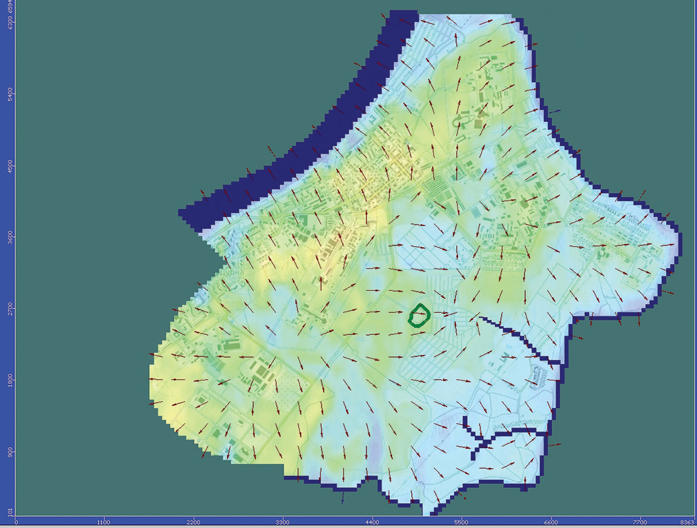 Рис. 6. Направление движения подземных вод в расчетной области.