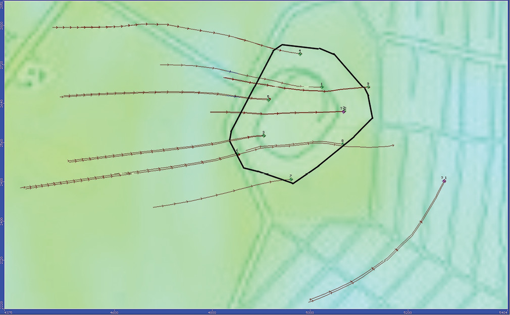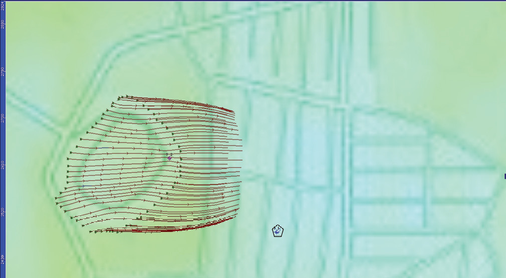 Рис. 7. Траектории движения загрязняющих веществ от границ полигона.