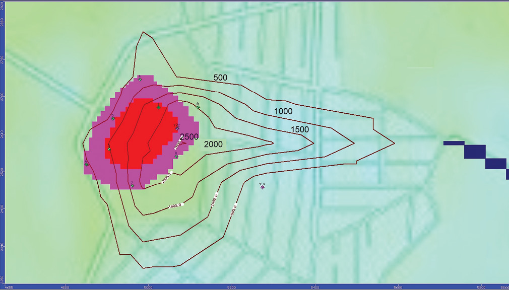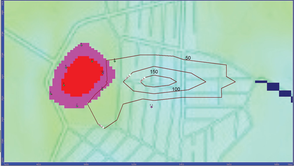 Рис. 10. Изолинии концентрации хлорид-иона в первом пласте через 10 лет после рекультивации свалочного тела, мг/л.