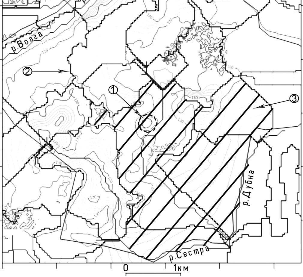 Рис. 11. Водосборные участки Волго-Дубнинско-Сестринского междуречья и область моделирования: 1 – полигон ТКО; 2 – границы локальных водосборных бассейнов; 3 – область моделирования.