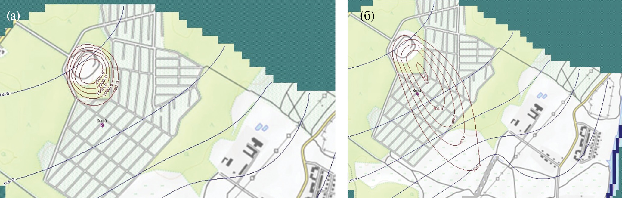 Рис. 13. Изолинии концентрации хлорид-иона (мг/л) в пласте после рекультивации свалочного тела через: а − 10 лет, б − 50 лет.
