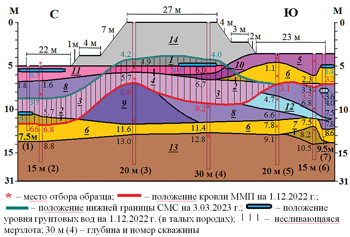 Оттаивание ММП под насыпью приводит к неравномерным просадкам земляного полотна. Его южная часть деформируется интенсивней северной части. Этому способствует вытаивание льдистого горизонта, залегающего на глубине около 6 м. Его фрагменты на глубинах 5–7 м обнаружены в непосредственной близости под южной частью насыпи (см. рис. 3, скв. 5, 6). В северной части дорожного полотна из-за повышения уровня ММП просадки менее выражены.