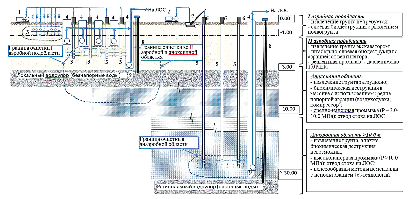 Во II аэробной подобласти – от (–3.00) до (–5.00) целесообразно извлечение загрязненного грунта экскавацией с вывозом на полигон. Методы очистки подобных грунтов сопряжены с необходимостью штабельно–слоевой биодеструкции в диапазоне исходных концентраций углеводородов от 2000 до 50000 мг/кг.масс. Аэрацию штабелей возможно проводить от средненапорных воздуходувных устройств с давлением нагнетания 1.0–3.0 кПа. Также возможна подача раствора флокулянта через дрены под давлением до 1.0–2.0 МПа.