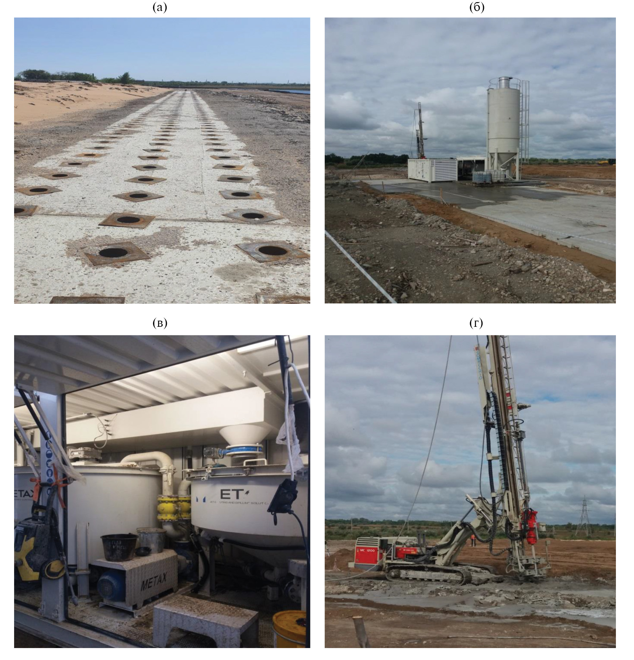 Рис. 2. Отдельные узлы сооружений высоконапорной реагентной очистки пород от углеводородных загрязнений: а − площадка нагнетательно-добывающих скважин с превенторами; б − высоконапорная насосная станция с реагентным хозяйством; в − узел приготовления раствора реагентов; г − передвижной высоконапорный экструдер (Jet – нагнетатель).