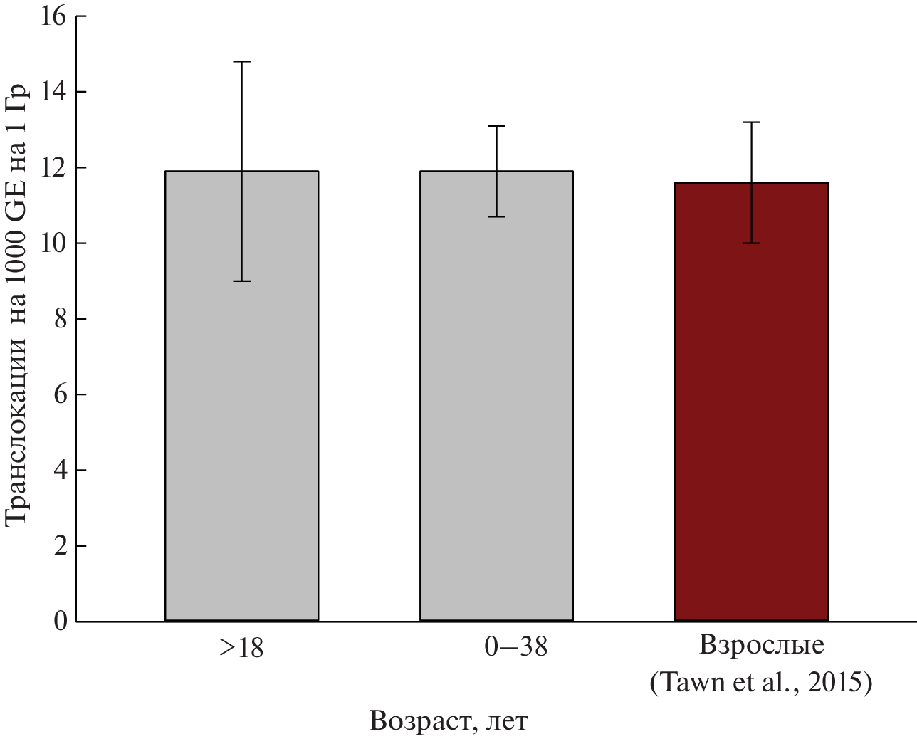 Оценка влияния возраста на частоту радиационно-индуцируемых транслокаций, регистрируемых методом FISH в циркулирующих в Т-лимфоцитах в отдаленный период после облучения, имеет как теоретический, так и практический интерес для целей биодозиметрии. Целью нашей работы был анализ дозовой зависимости частоты транслокаций в Т-лимфоцитах периферической крови у доноров различного возраста, подвергшихся облучению в прибрежных селах р. Теча (n = 197). В цитогенетических исследованиях использовали цельно-хромосомные зонды для окрашивания трех пар хромосом. Всего было просчитано 104 721 геном-эквивалентов (GE) и обнаружено 2540 транслокаций. Для каждого донора индивидуальные дозы облучения, поглощенные в органах и тканях к моменту забора крови, были рассчитаны с использованием дозиметрической системы р. Теча. Кроме того, были рассчитаны дозы на Т-лимфоциты и их предшественников с использованием оригинального модельного подхода с учетом возрастной динамики Т-лимфоцитов; именно с этими дозами были связаны возрастные зависимости частоты транслокаций. Основными источниками облучения доноров были 89,90Sr, накапливающиеся в кости и практически локально облучающие костный мозг. Для оценки параметров зависимости доза–эффект использовали линейную регрессионную модель. После учета фоновых значений наименьшая частота транслокаций на 1000 GE на Гр была выявлена у доноров в возрасте 0–5 лет на момент облучения (9.3 ± 1.3), что статистически значимо ниже, чем у детей 6–18 лет (15.3 ± 1.5), но не у взрослых (11.9 ± 2.9). Значение для взрослых (>18 лет) характеризовалось максимальным разбросом, но оказалось близким к величинам, полученным в международном исследовании профессионалов после внешнего облучения (11.6 ± 1.6). Значения фоновых частот транслокаций, определенных в различных возрастных группах, соответствуют опубликованным значениям, полученным в объединенном международном исследовании по необлученным донорам. Мы также подтвердили отсутствие влияние пола на частоту транслокаций.