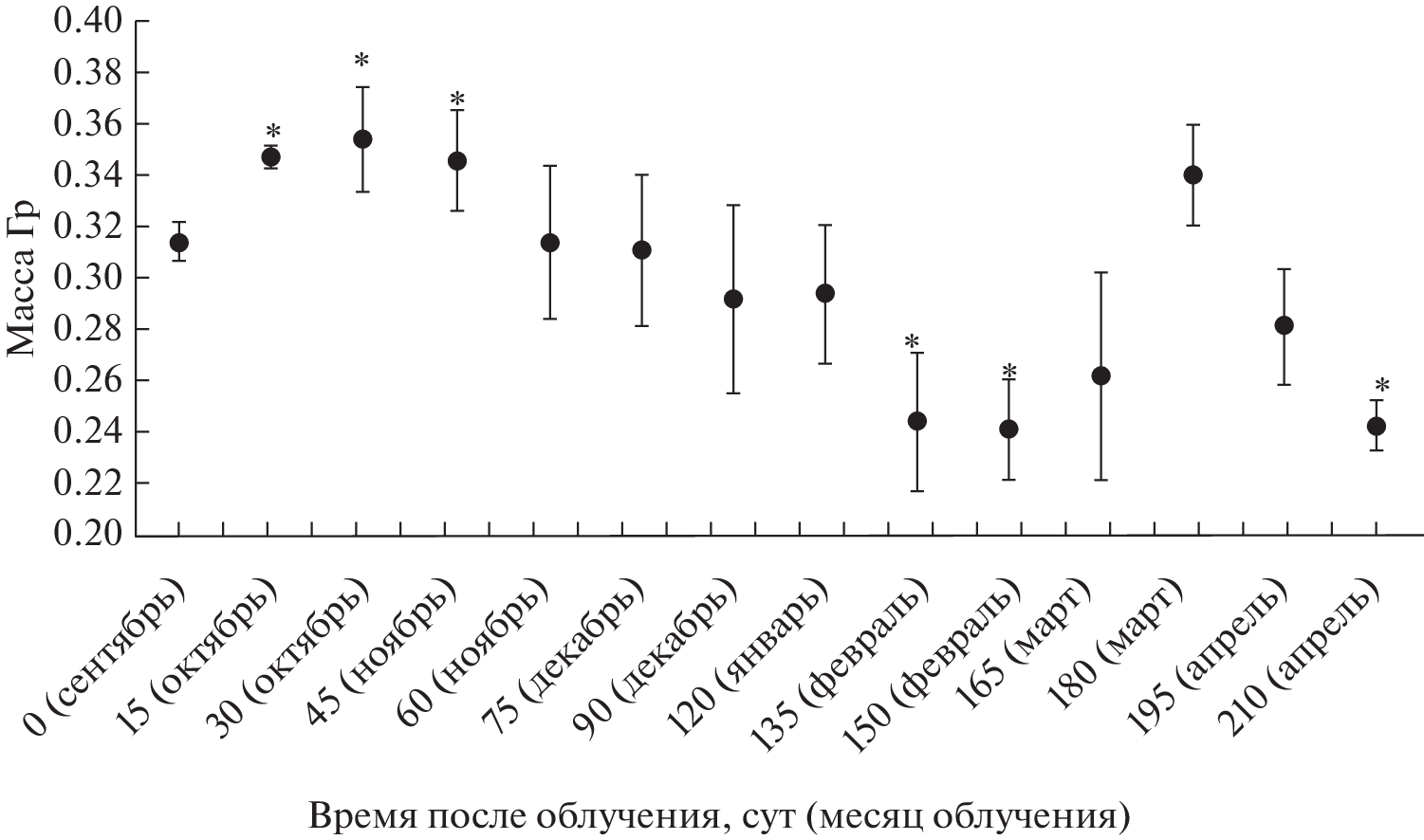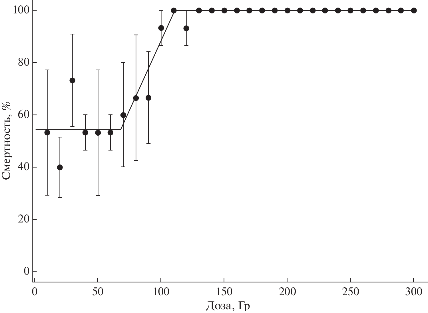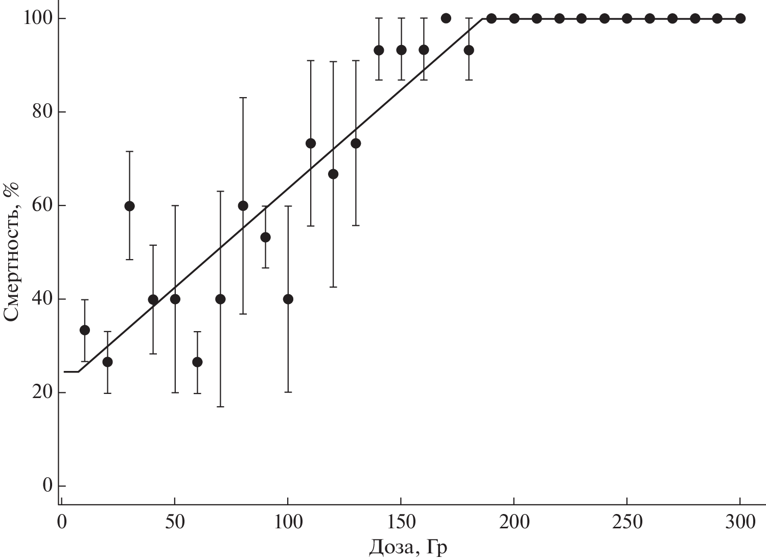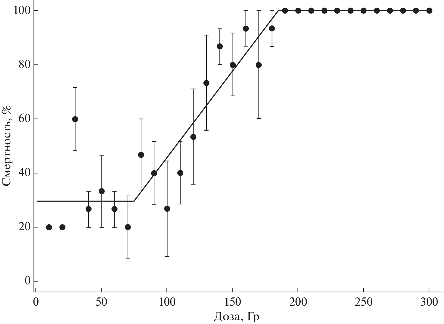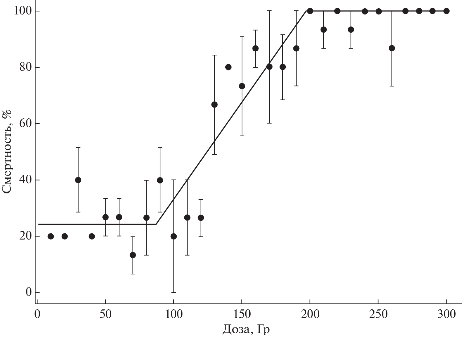 The results of the study of relevant indicators of mortality and biomass after ɣ-irradiation in the dose of 10–300 Gy of the terrestrial mollusk F. fruticum M. are presented. Mollusks of the second age group were selected. The age of the mollusks was determined by the number of revolutions of the shell. The conditions of keeping the mollusk in the laboratory were experimentally selected in such a way that the survival rate in the control group was 100%. The duration of the experiment (210 days) and the range of radiation doses (10–300 Gy) made it possible to establish the LD50/60 index for a terrestrial mollusk of the second age group. It is 115.6 ± ± 33.8 Gy. LD50/60 was determined by the calculated method of probit analysis using the least squares method. Three dose ranges (10–100, 110–170 and 180–300 Gy of changes in the studied relevant indicators were established. For each time range, starting from 60 days after irradiation, a linear threshold dependence with three dose ranges was established: a dose-independent plateau at low radiation doses, a dose-dependent range with an increase in the radiation dose, and a dose-independent plateau when absolute mortality occurs.
