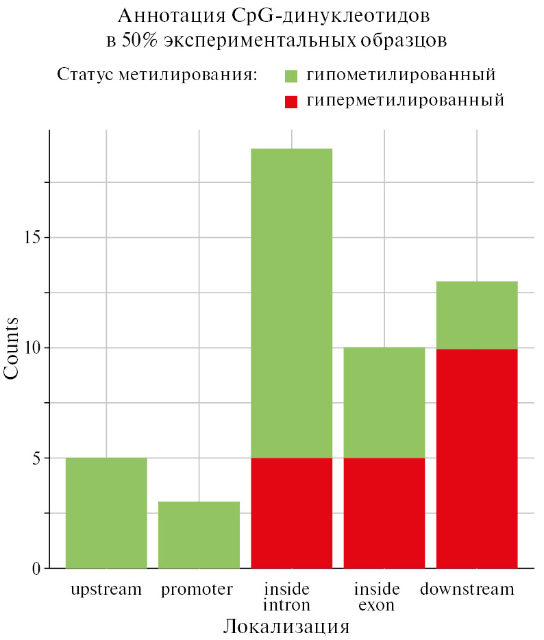 Распределение дифференцированно метилированных цитозинов относительно областей гена (экзонов, интронов, промоторов, восходящих и нисходящих нетранслируемых (некодирующих) областей) у экспериментальных образцов показано на рис. 1. Для цитозинов, которые изменили статус метилирования в CpG-динуклеотидах после воздействия γ-излучения на кровь in vitro, гипометилирование ДНК наиболее характерно для восходящих нетранслируемых областей и области промотора, а гиперметилирование ДНК в большей степени характерно для нисходящих нетранслируемых областей.