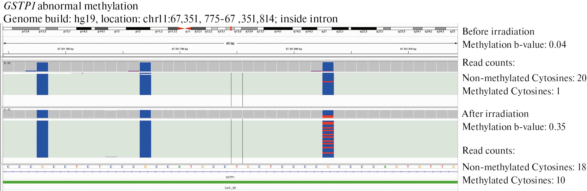 Рис. 2. Пример визуализации аномального метилирования ДНК внутри интрона GSTP1 после облучения лимфоцитов крови in vitro, полученный с использованием геномного браузера Integrative Genomic Browser (IGV).