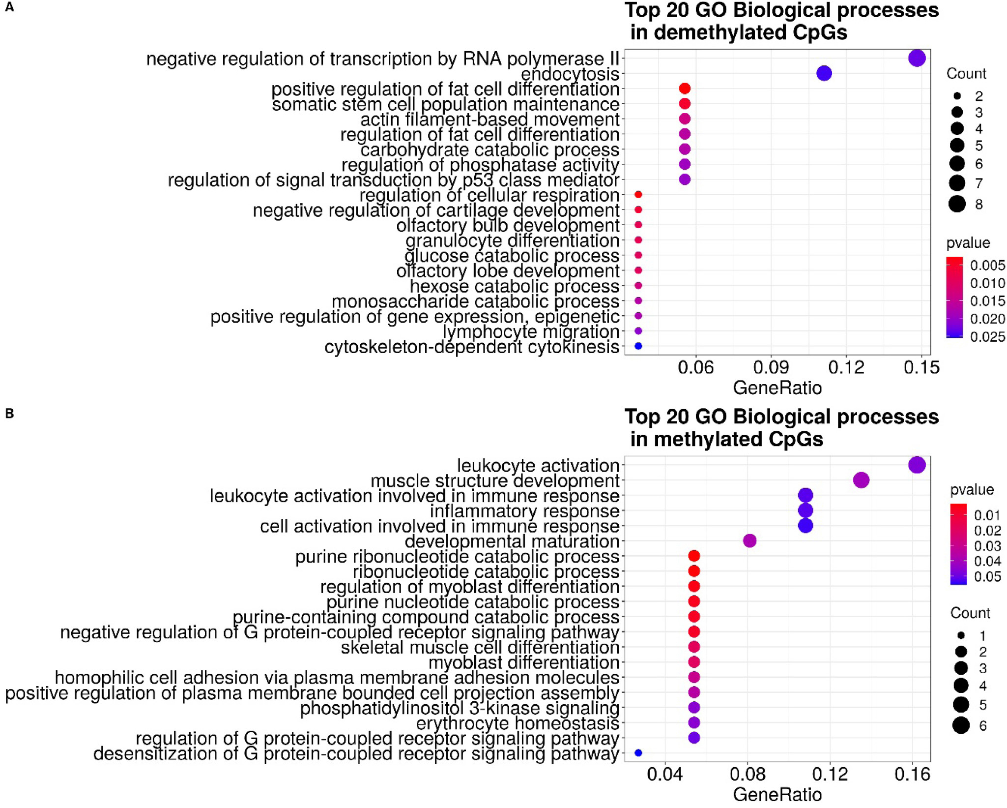 Fig. 3. Top 20 enriched Gene Ontology (GO) Biological processes terms with GeneRatio (Num. of genes in process/Num. of total input genes) on X-axis and GO terms on Y-axis in CpGs demethylated (A) and CpGs hypermethylated (B) detected in at least 50٪ of the experimental samples.