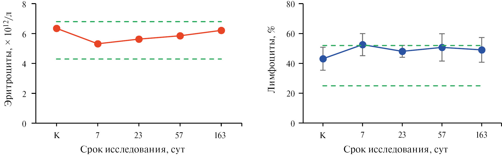 Рис. 4. Уровень эритроцитов и лимфоцитов в разные сроки наблюдений после локального облучения головы обезьян Macaca mulatta. Прерывистыми линиями обозначены референсные значения.