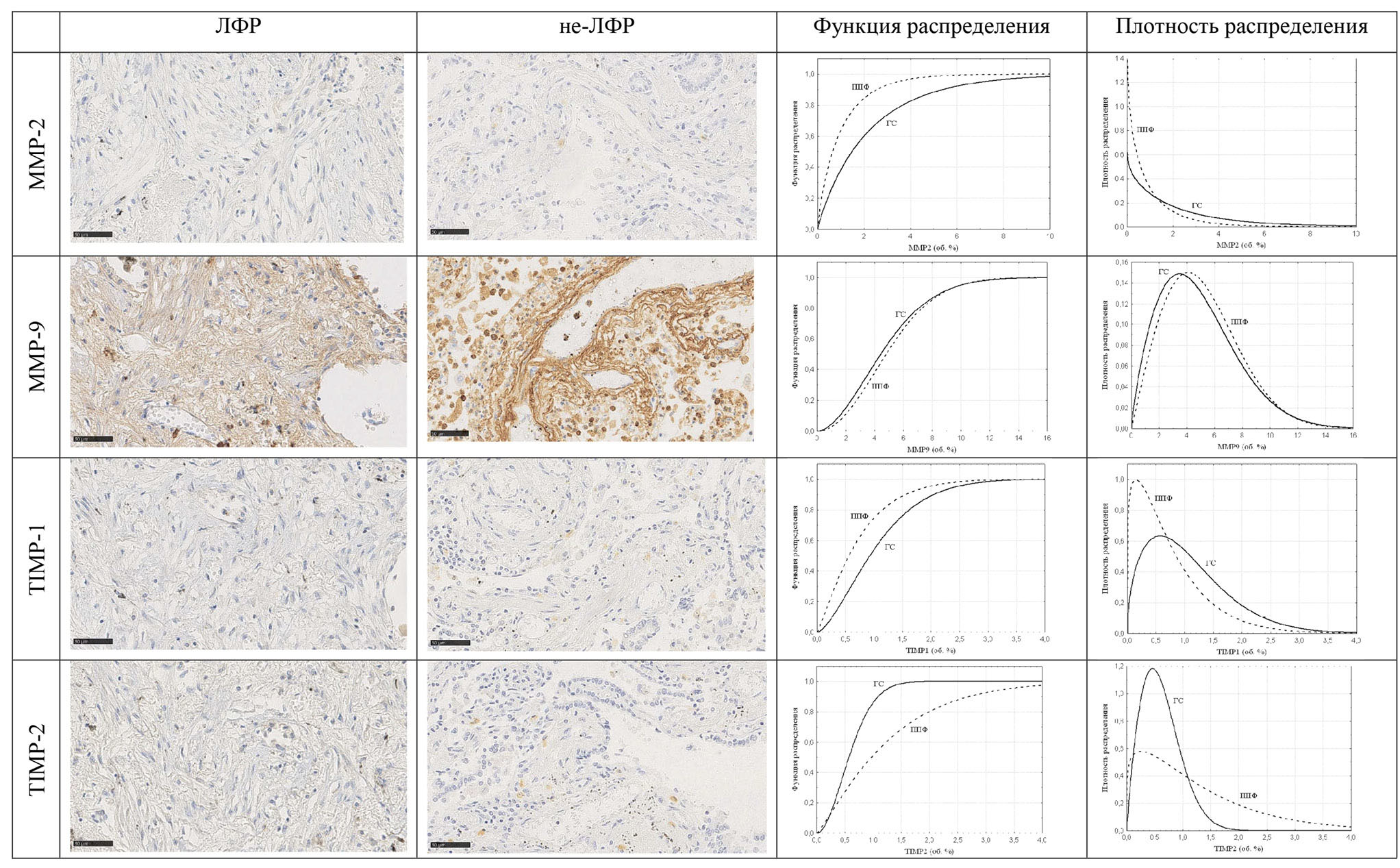 При анализе структурных компонентов соединительной ткани в препаратах обеих групп с фиброзом обнаружены статистически значимые различия почти всех исследованных показателей (за исключением экспрессии MMP-2). Общая выраженность легочного фиброза более всего определялась в микропрепаратах 1-й группы; общий объем пораженной фиброзом легочной ткани в препаратах 1-й группы был выше на 40٪ по сравнению с группой контроля. Выраженность сопутствующей эмфиземы по результатам измерения ИРБ наиболее представлена в группе не-ЛФР. Также в 1-й и 2-й группах выявлено снижение плотности ретикулярной стромы; однако количество ретикулярных волокон в образцах не-ЛФР было незначительно уменьшено.