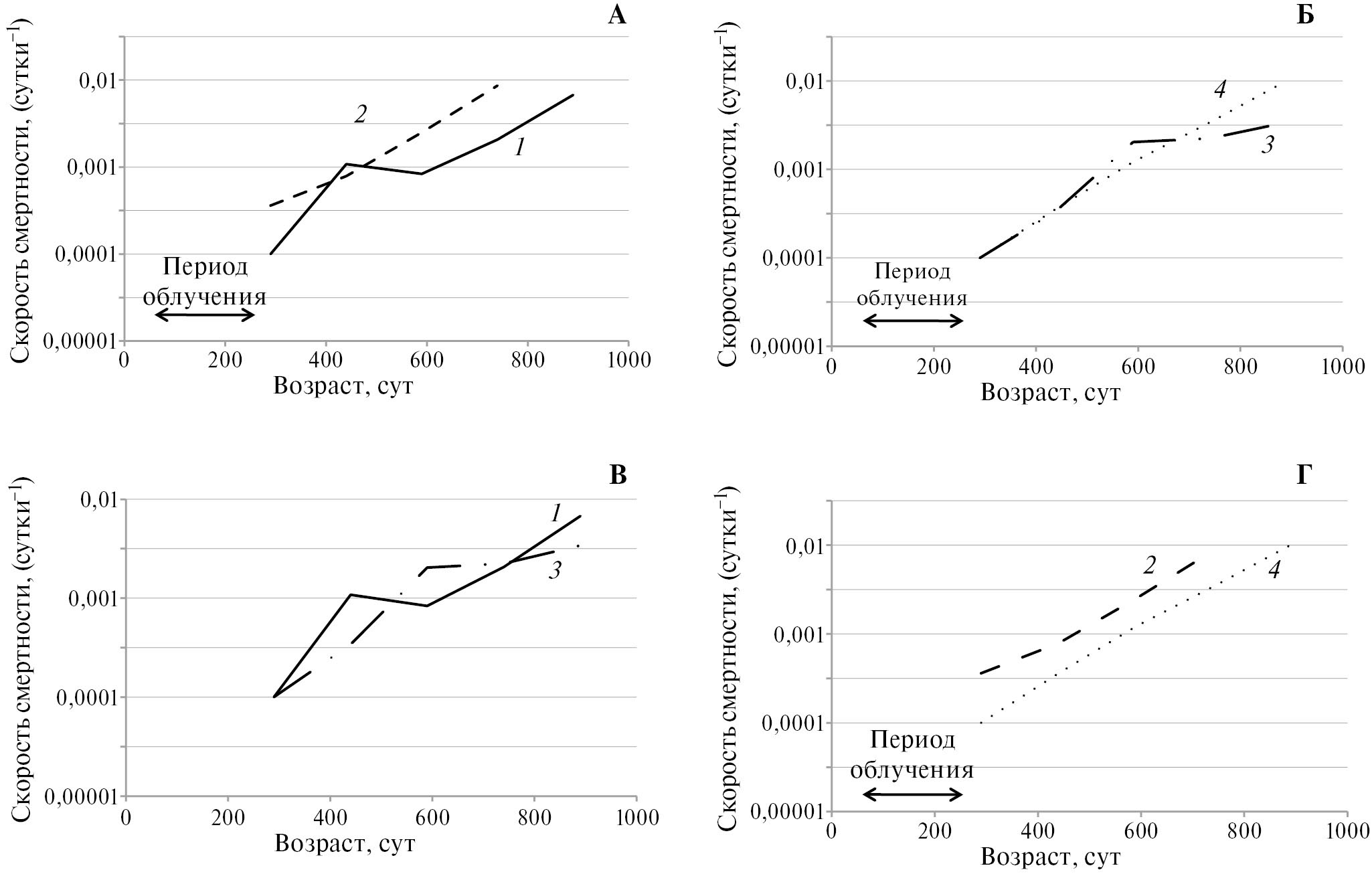 Рис. 2. Скорость смертности самок мышей ICR (CD-1), облученных фракционно в суммарной дозе 1.65 Гр и необлученных (графики Гомпертца): А — облученные (2) и необлученные (1), содержавшиеся на водопроводной воде; Б — облученные (4) и необлученные (3), содержавшиеся на дистиллированной воде; В — необлученные, содержавшиеся на водопроводной (1) и дистиллированной (3) воде; Г — облученные, содержавшиеся на водопроводной (2) и дистиллированной (4) воде.